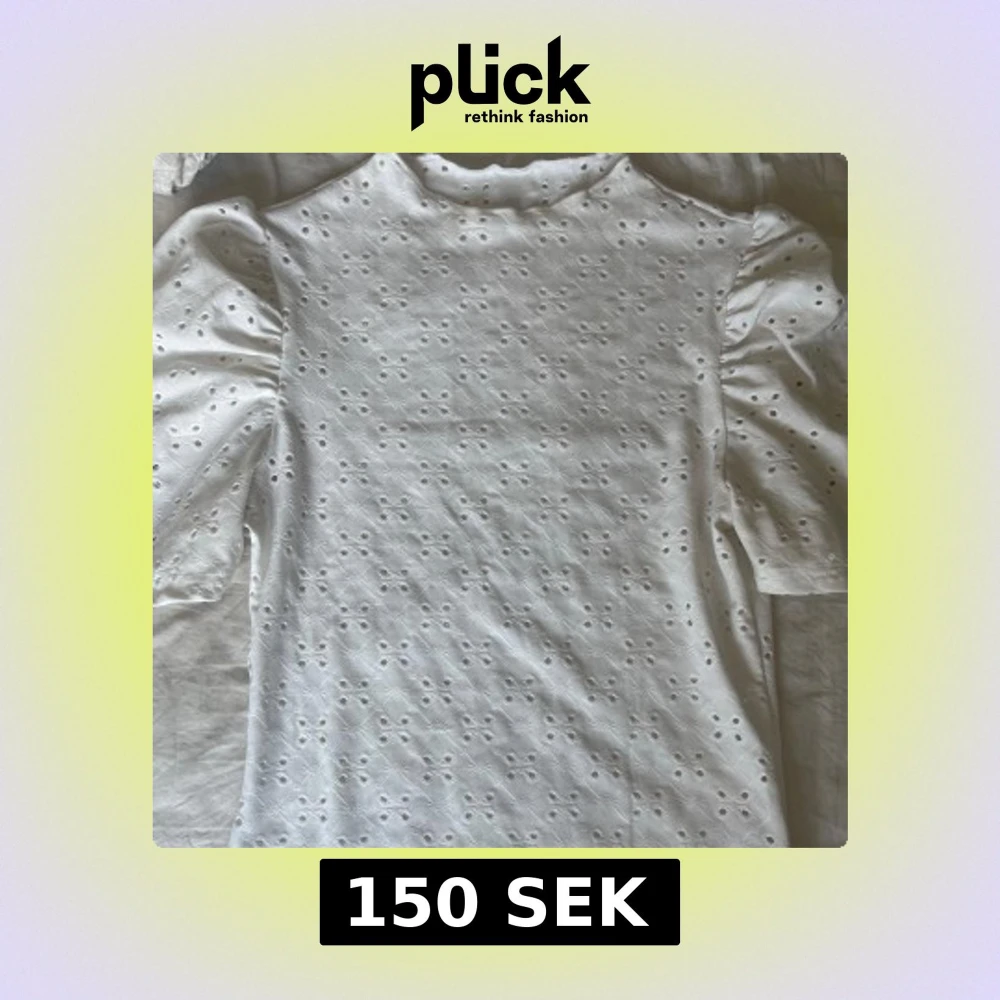 Superfin vit topp med puffiga ärmar och broderade hålmönster över hela tyget. Ytterst lite genomskinlig. Skulle säga storlek xs/s. Fint skick🩷