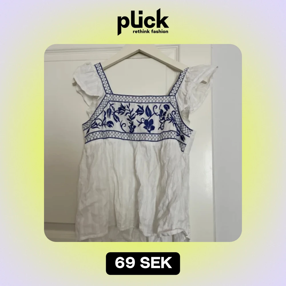 Vit topp med blåa detaljer, går att knyta i ryggen🤍säljer för den ej kommer till användning