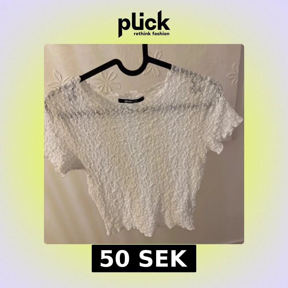 Superfin vit topp från Gina Tricot med crinklad struktur och korta ärmar. Modellen är croppad och har en lätt vågig kant nertill och vid ärmslut.