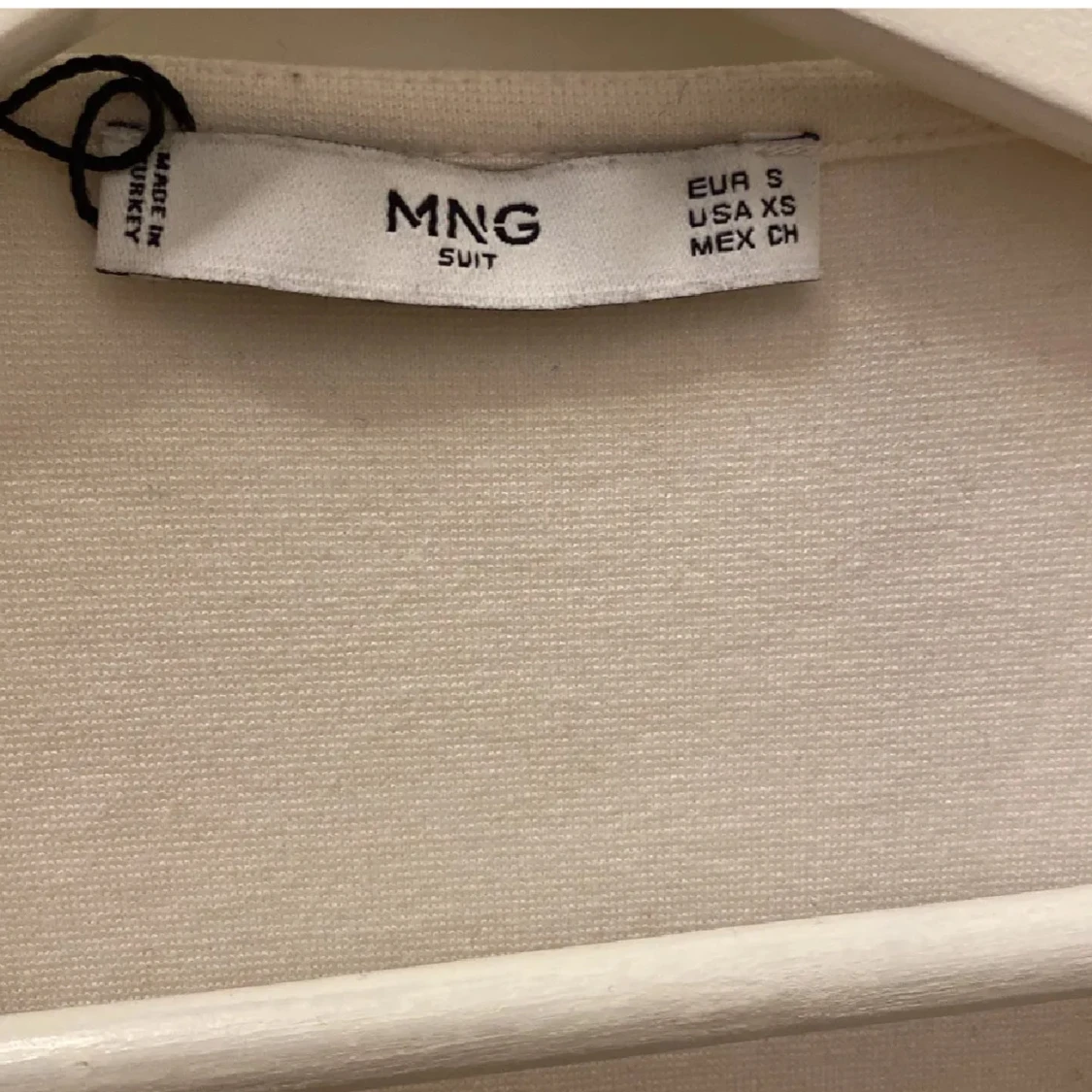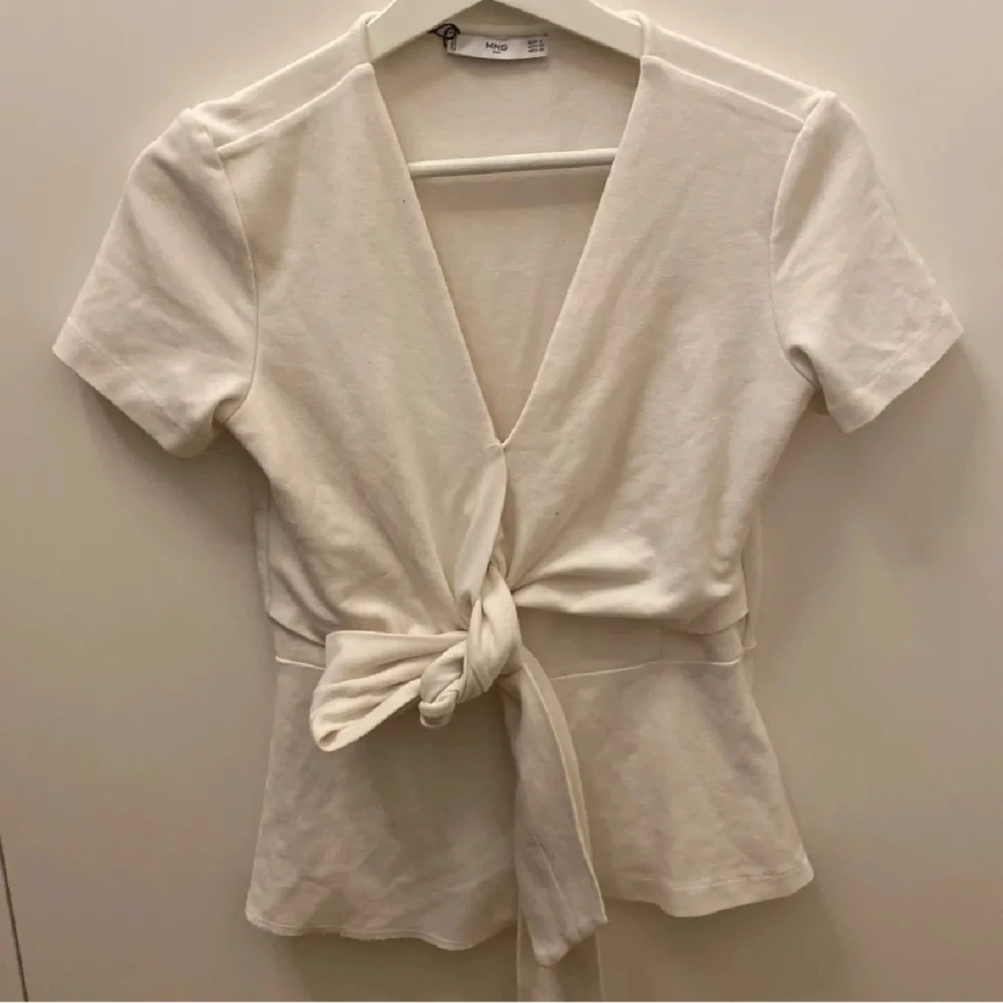 Säljer en stilren vit v-ringad topp från MNG Suit. Toppen har korta ärmar och ett knytband som man knyter runt midjan. INTE MINA BILDER
