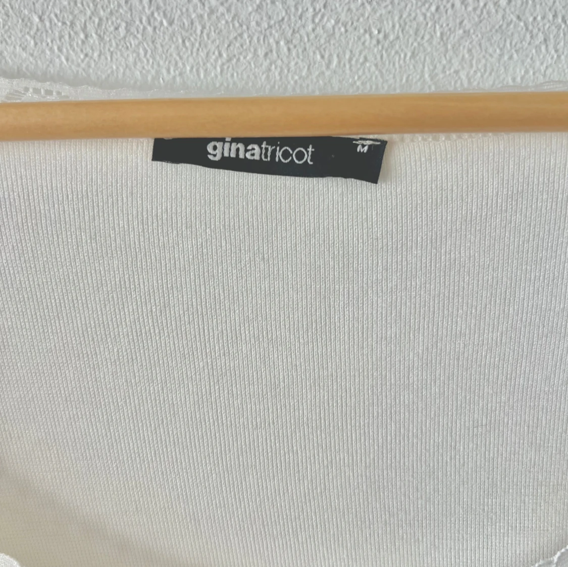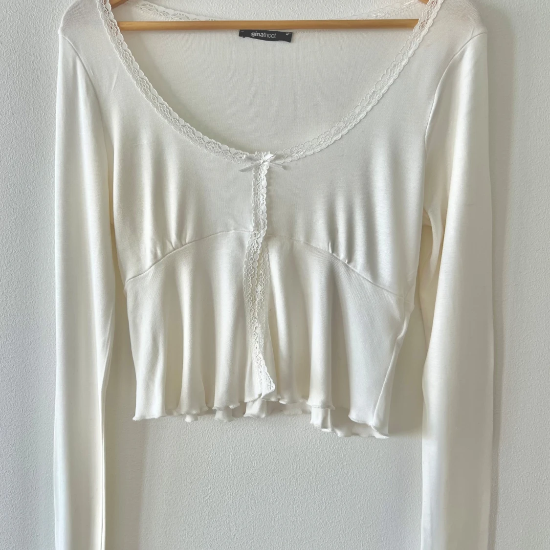 Supersöt vit blus från Gina Tricot med långa ärmar, spetsdetaljer längs urringningen och framtill, samt liten rosett vid bysten. Blusen har en lätt utsvängd nederdel och knyt framtill för extra cute vibe.