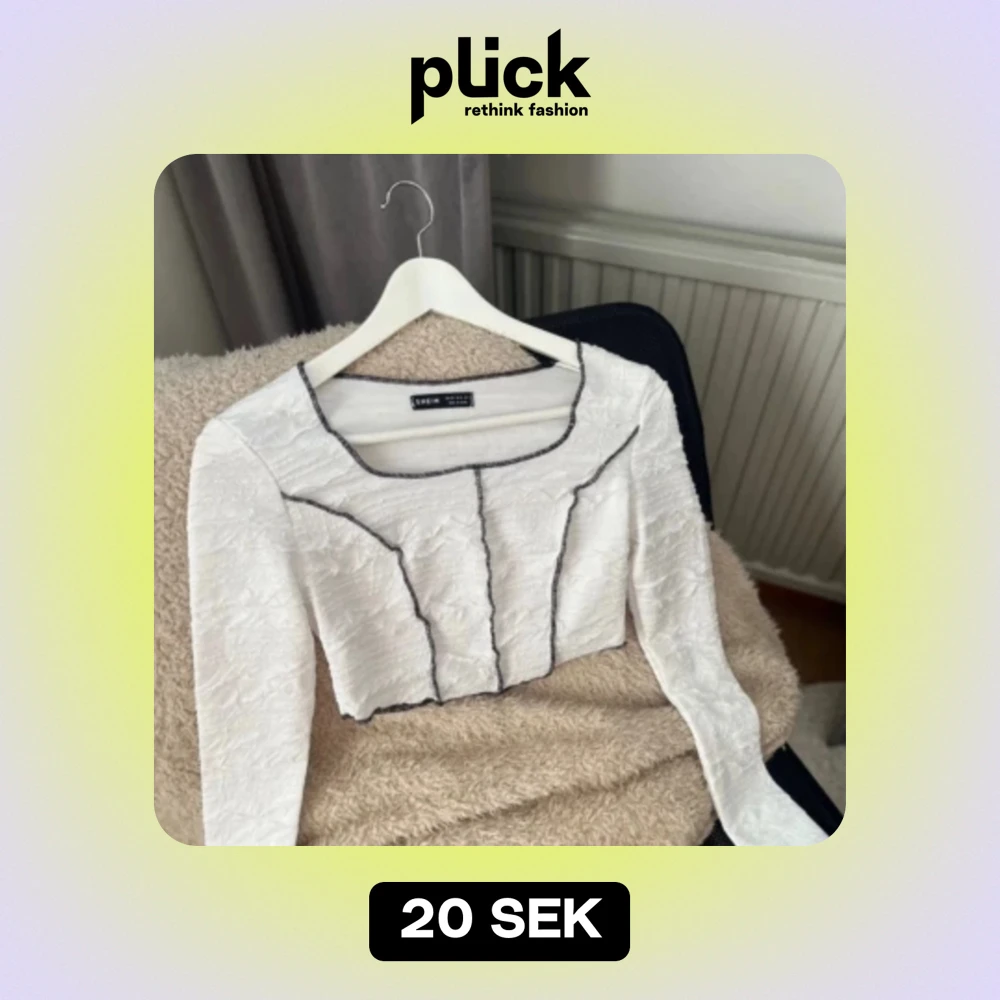 Säljer en snygg vit topp från SHEIN i storlek XS. Toppen har en unik design med svarta kontrastsömmar som ger den ett coolt utseende. Den är långärmad och perfekt för både vardag och fest. Materialet känns bekvämt och lätt att bära.