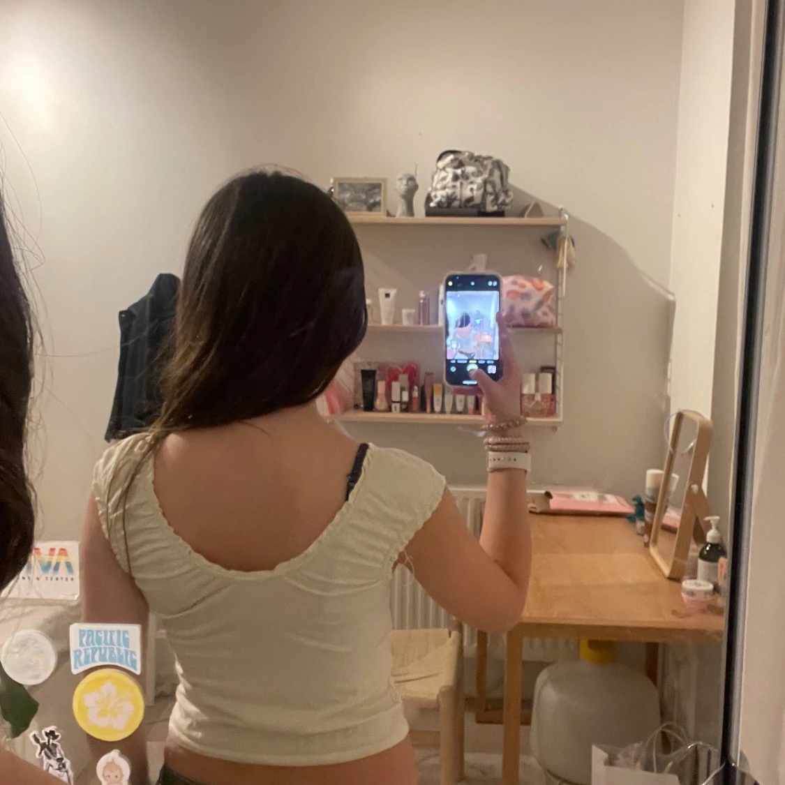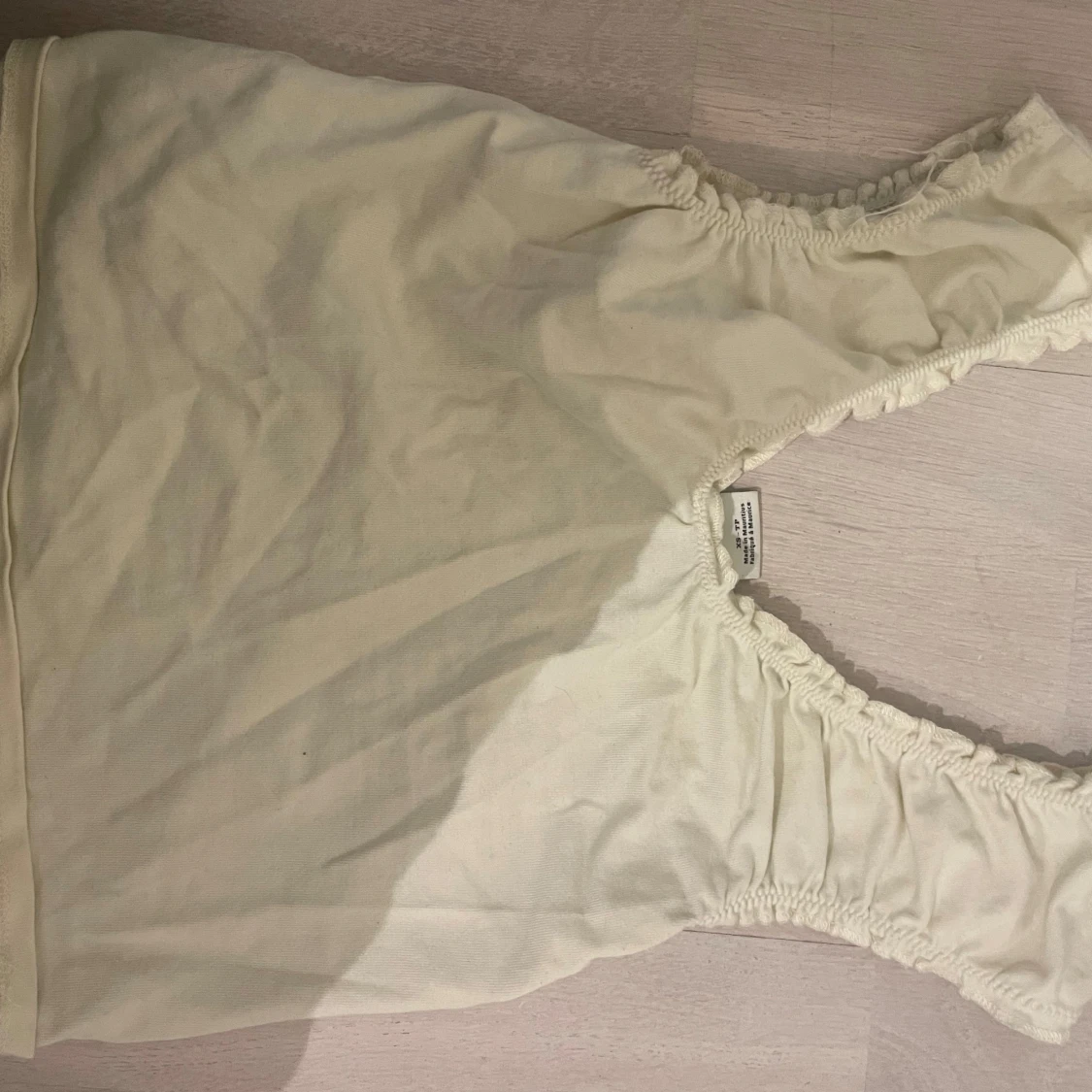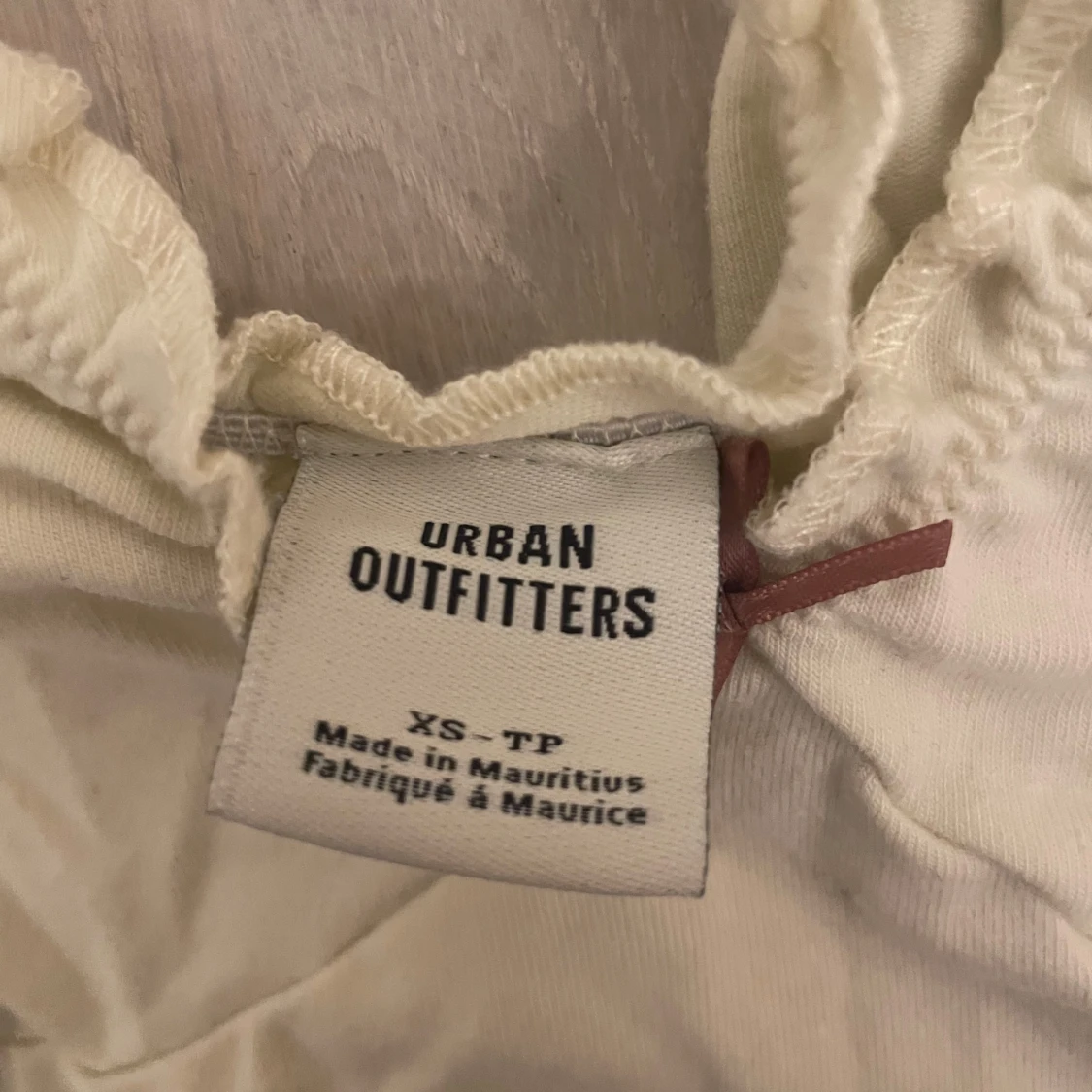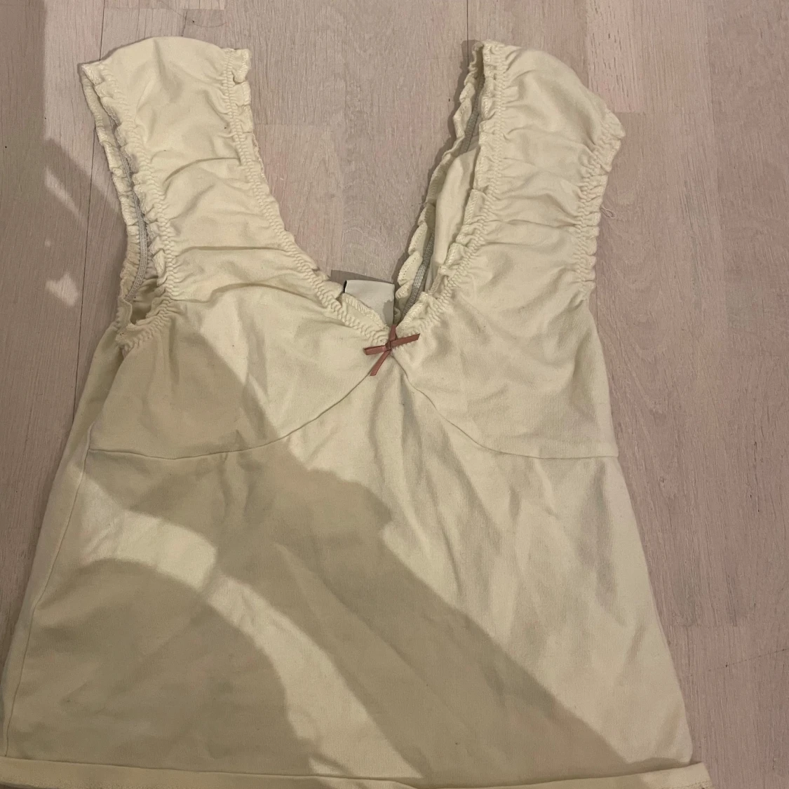 Säljer en söt vit topp från Urban Outfitters med en liten rosett framtill. Toppen har en v-ringad design och är ärmlös med rynkade detaljer vid axlarna. Perfekt för en avslappnad stil. Skriv gärna om du har frågor!💕❤️