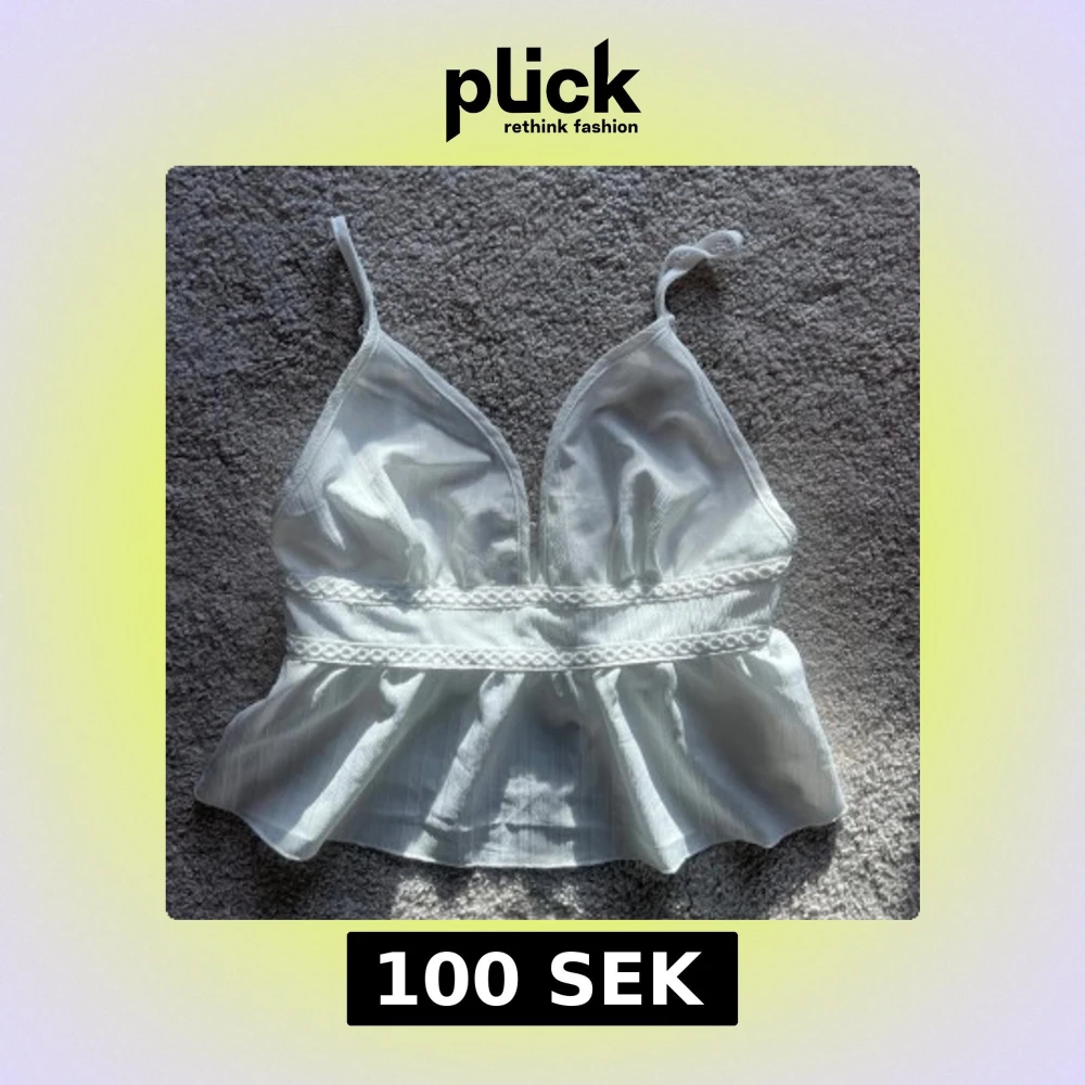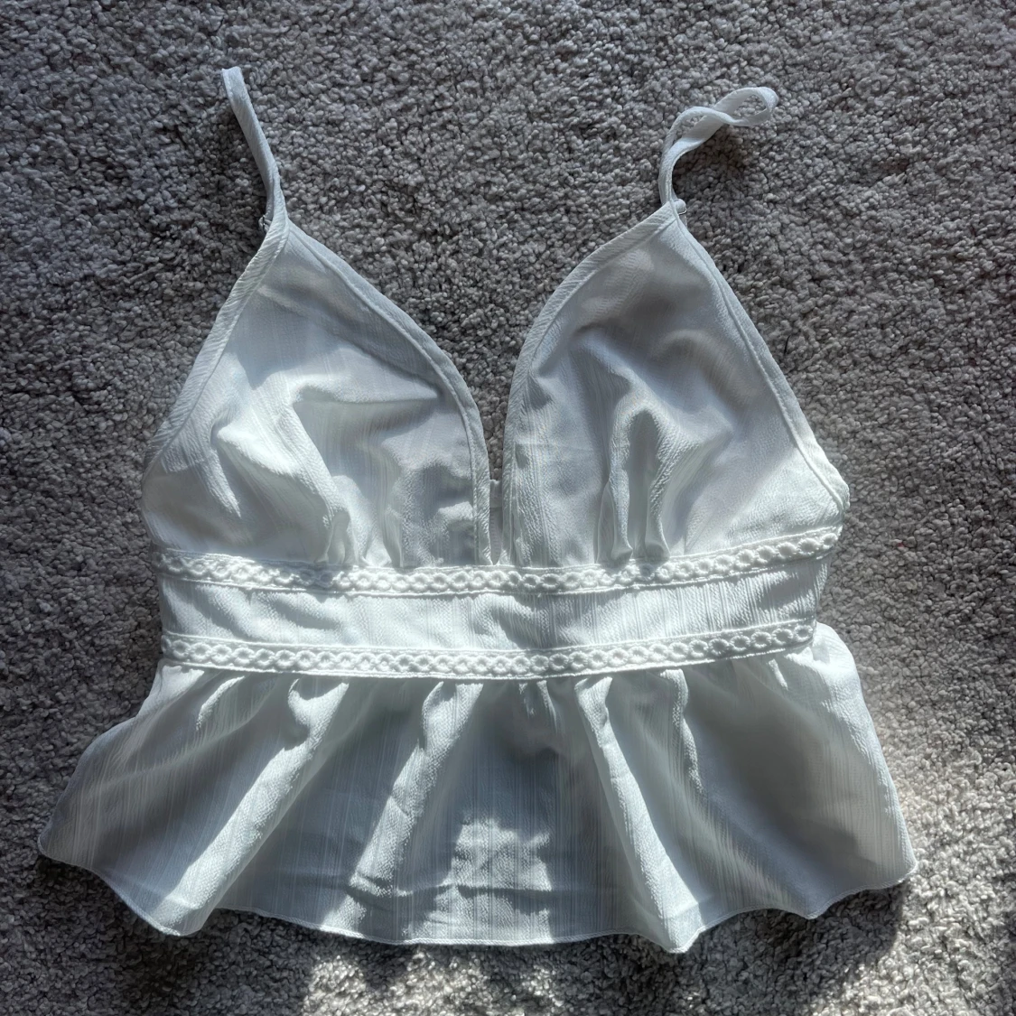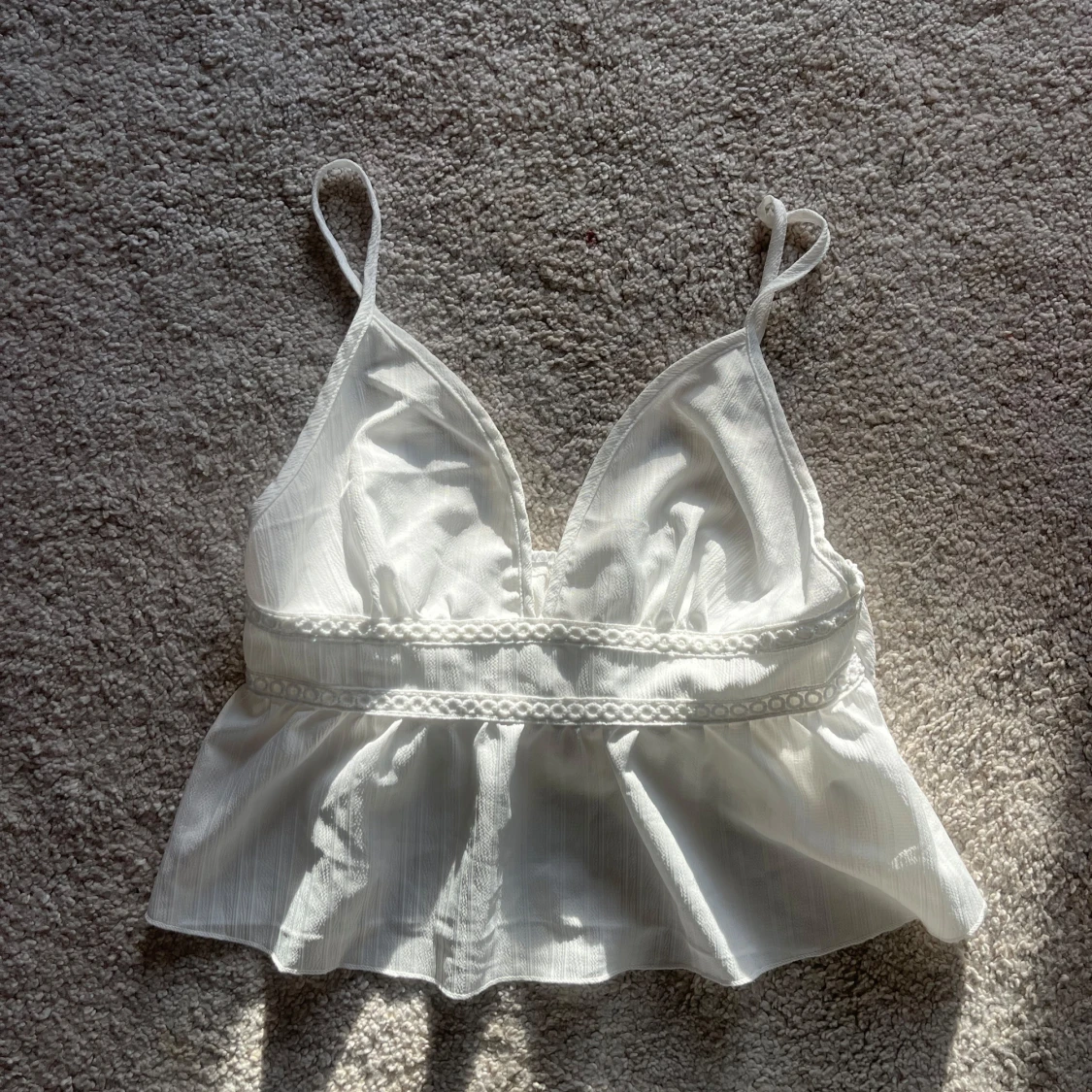 Säljer en söt vit topp med smala axelband och volangdetaljer. Perfekt för i sommaren! ☀️❤️