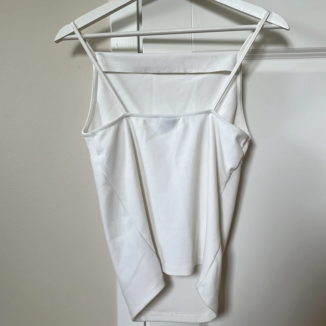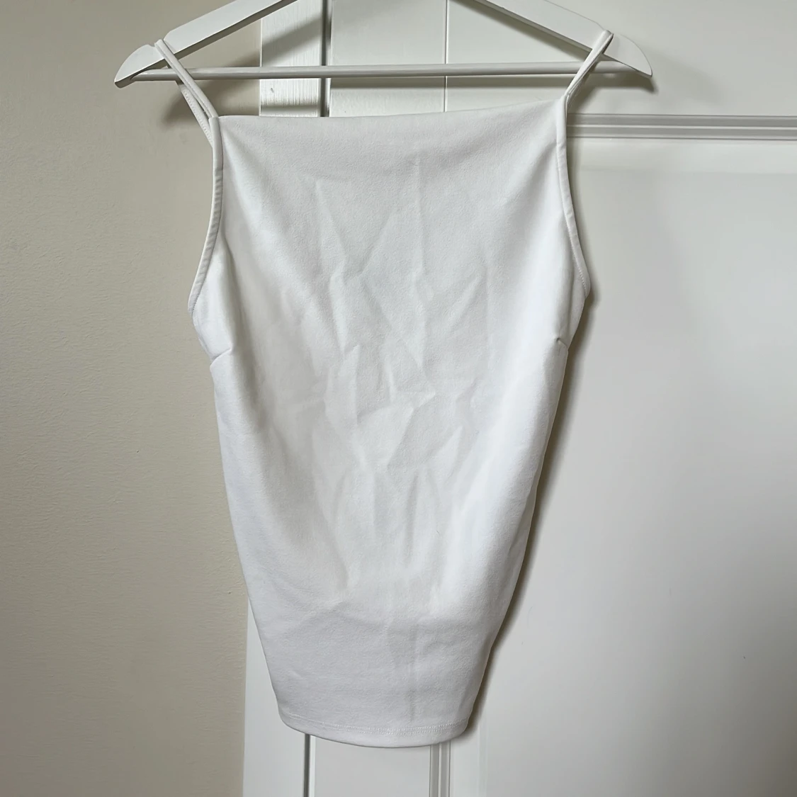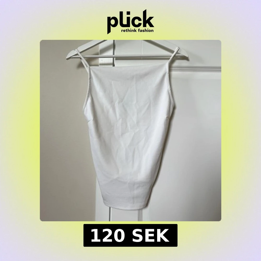 Säljer denna stilrena topp/linne från Gina Tricot. Materialet känns lyxigt. Rak halsring och lite djup rygg🤍 Finns inga sminkmärken
