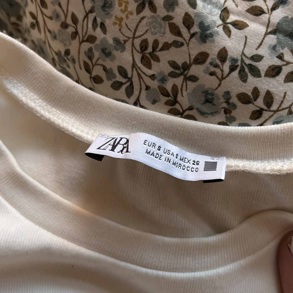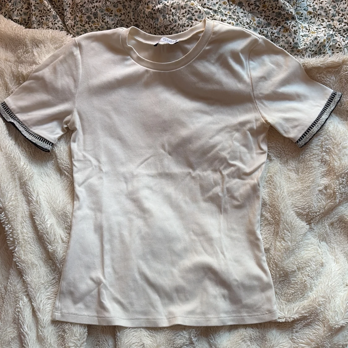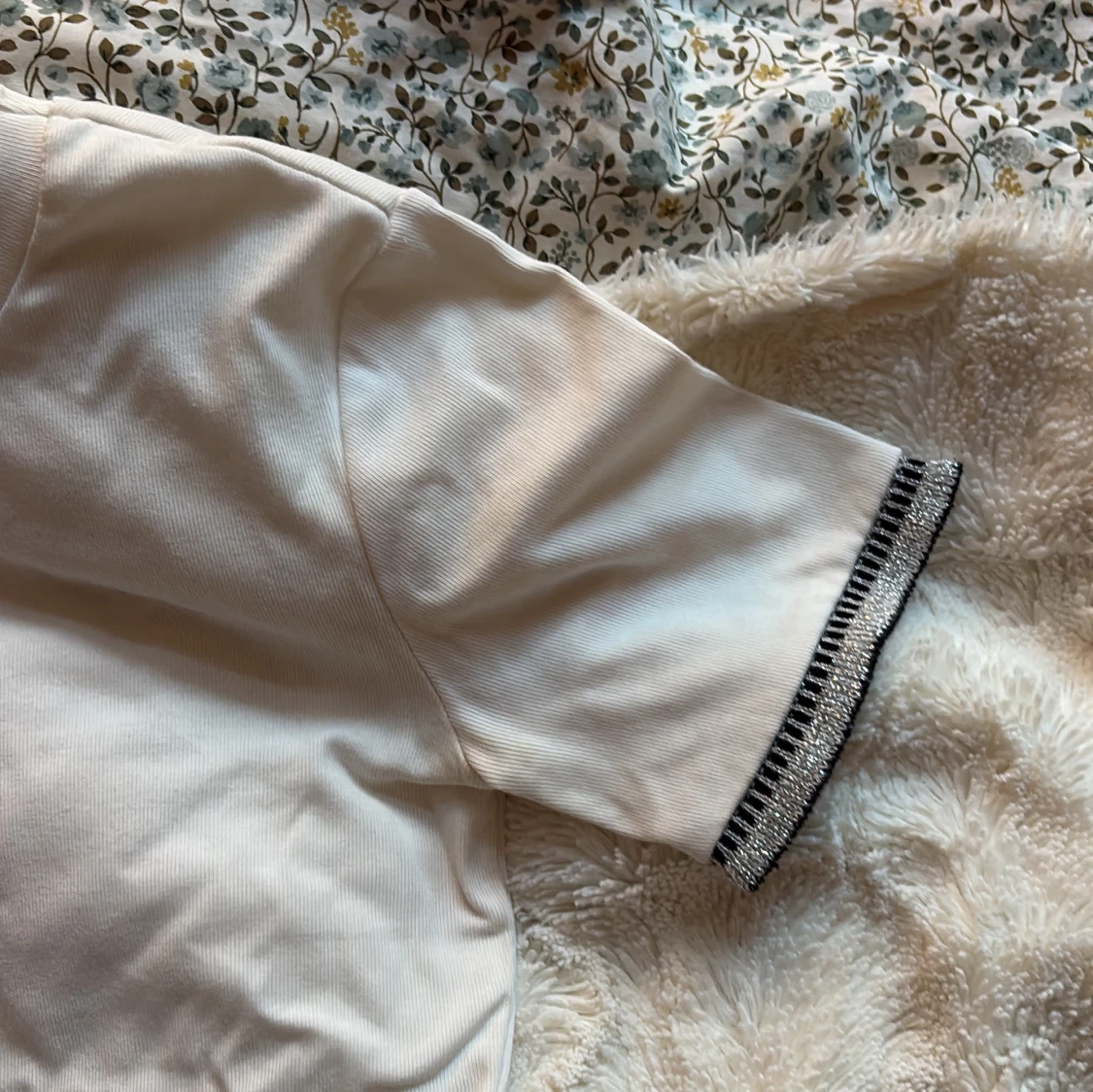 Snygg vit topp från Zara med korta ärmar och rund hals. Ärmsluten har en glittrig silverdetalj och svart kant som ger en extra touch. Toppens passform är normal och materialet känns mjukt och bekvämt, perfekt till jeans eller kjol.