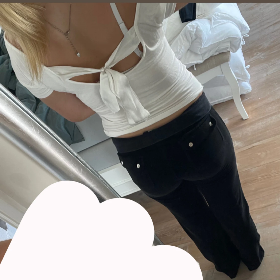 Säljer en vit topp med korta ärmar och snygg öppen rygg med knytband. storlek m men sitter som xs/s. Toppen är figurnära och har en enkel, stilren look framtill medan ryggen har en cool detalj med rosett. Perfekt för dig som gillar trendiga plagg