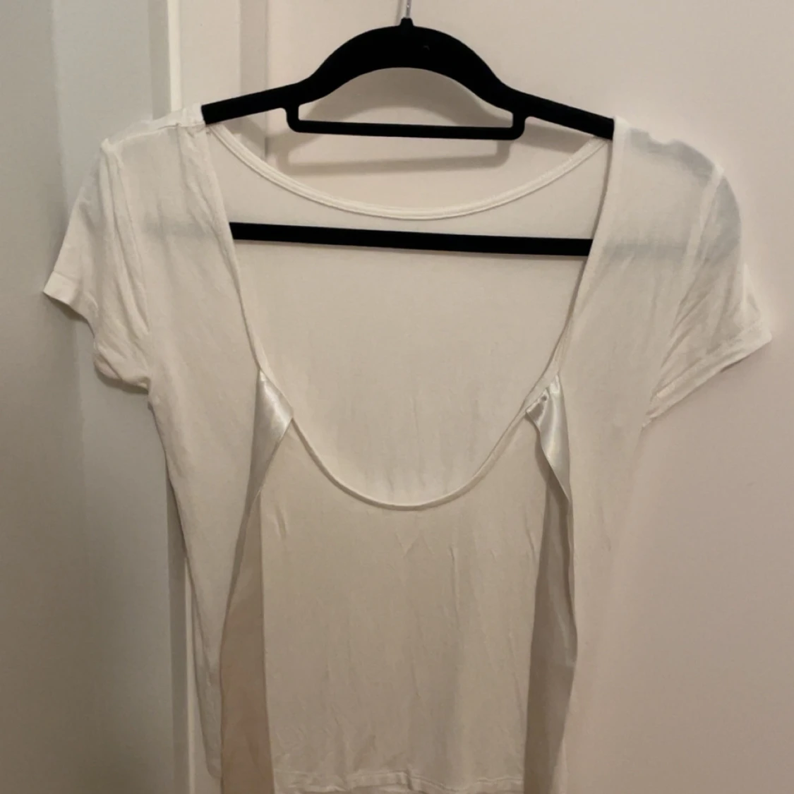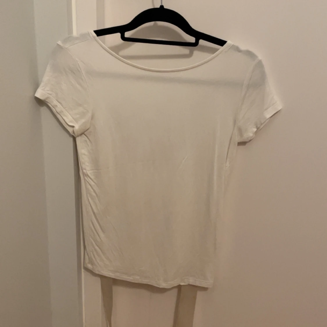 Säljer en vit kortärmad topp med rund halsringning fram och djup öppen rygg med knytband. Toppens enkla design gör den lätt att styla och den är tillverkad i mjukt bomullsmaterial. Perfekt för dig som gillar minimalistisk stil med en twist.