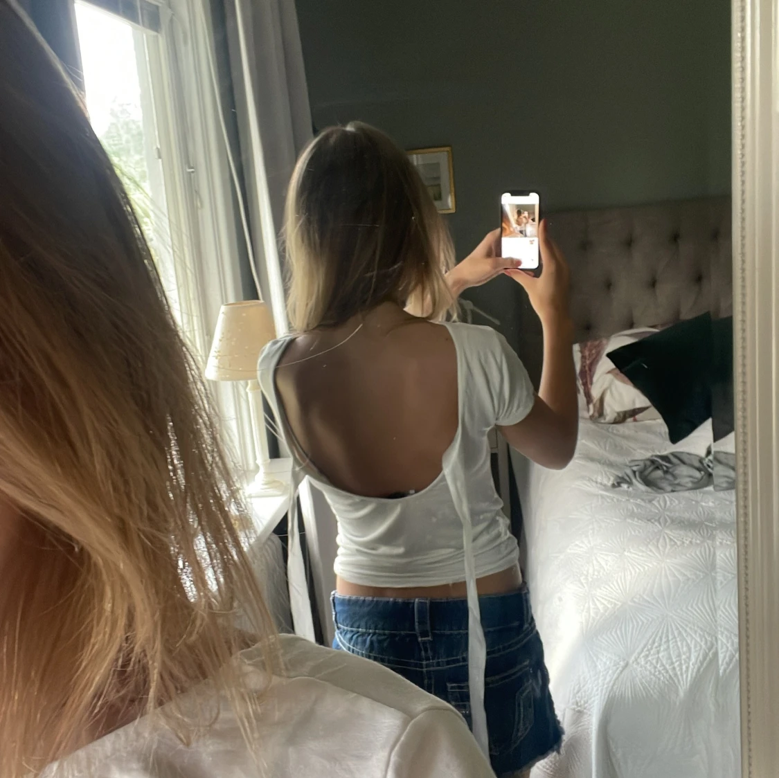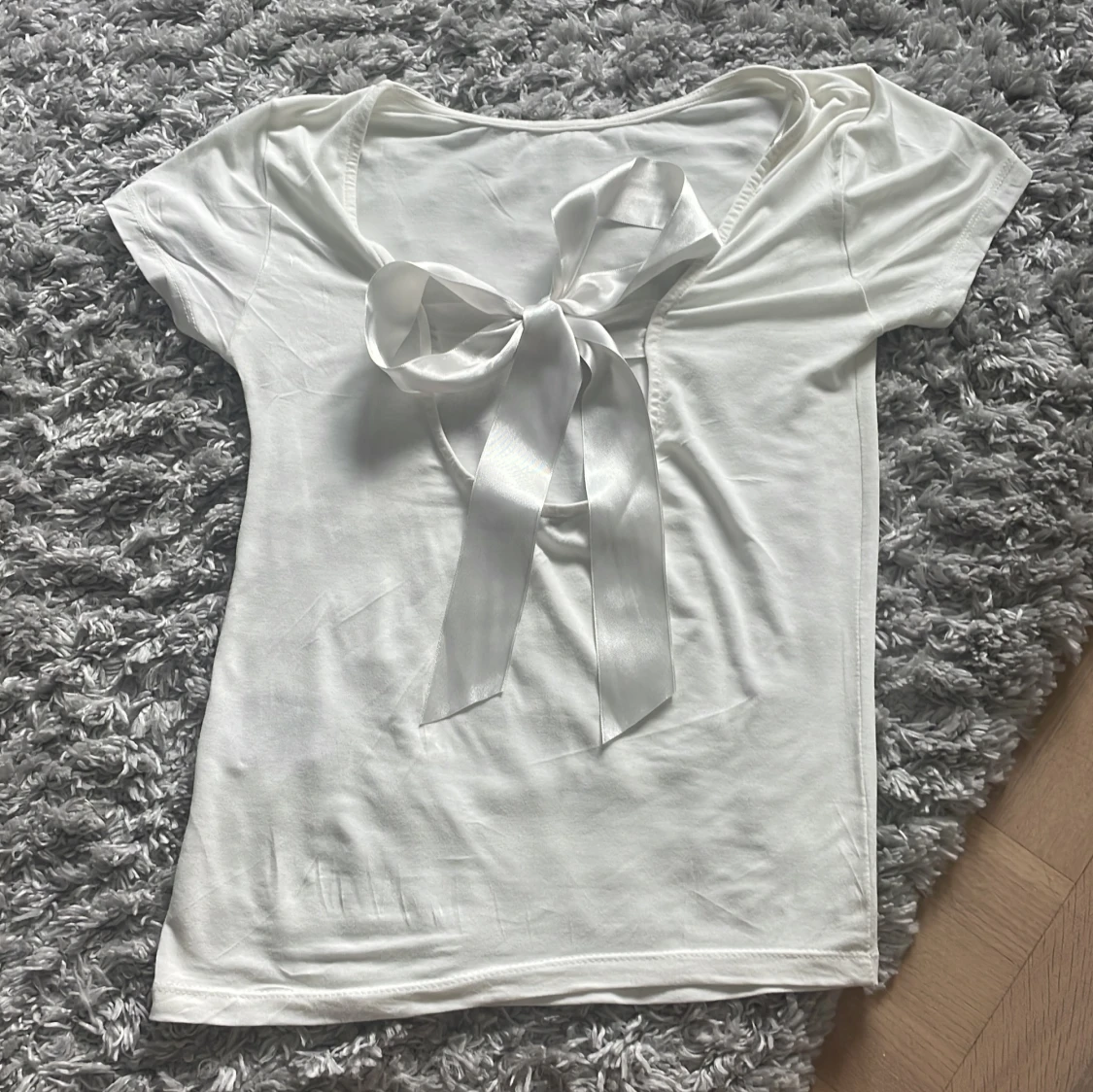 Pris kan diskuteras❤️Supersöt vit topp i mjukt material med korta ärmar och en stor rosett i satin baktill. Toppen har öppen rygg som ger en snygg och trendig look. Perfekt att styla med jeans eller kjol för en fräsch vibe. Andvänd få tal gånger❤️