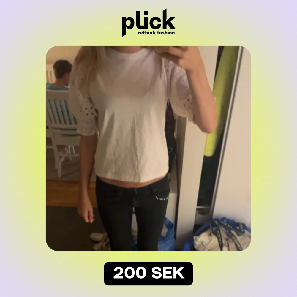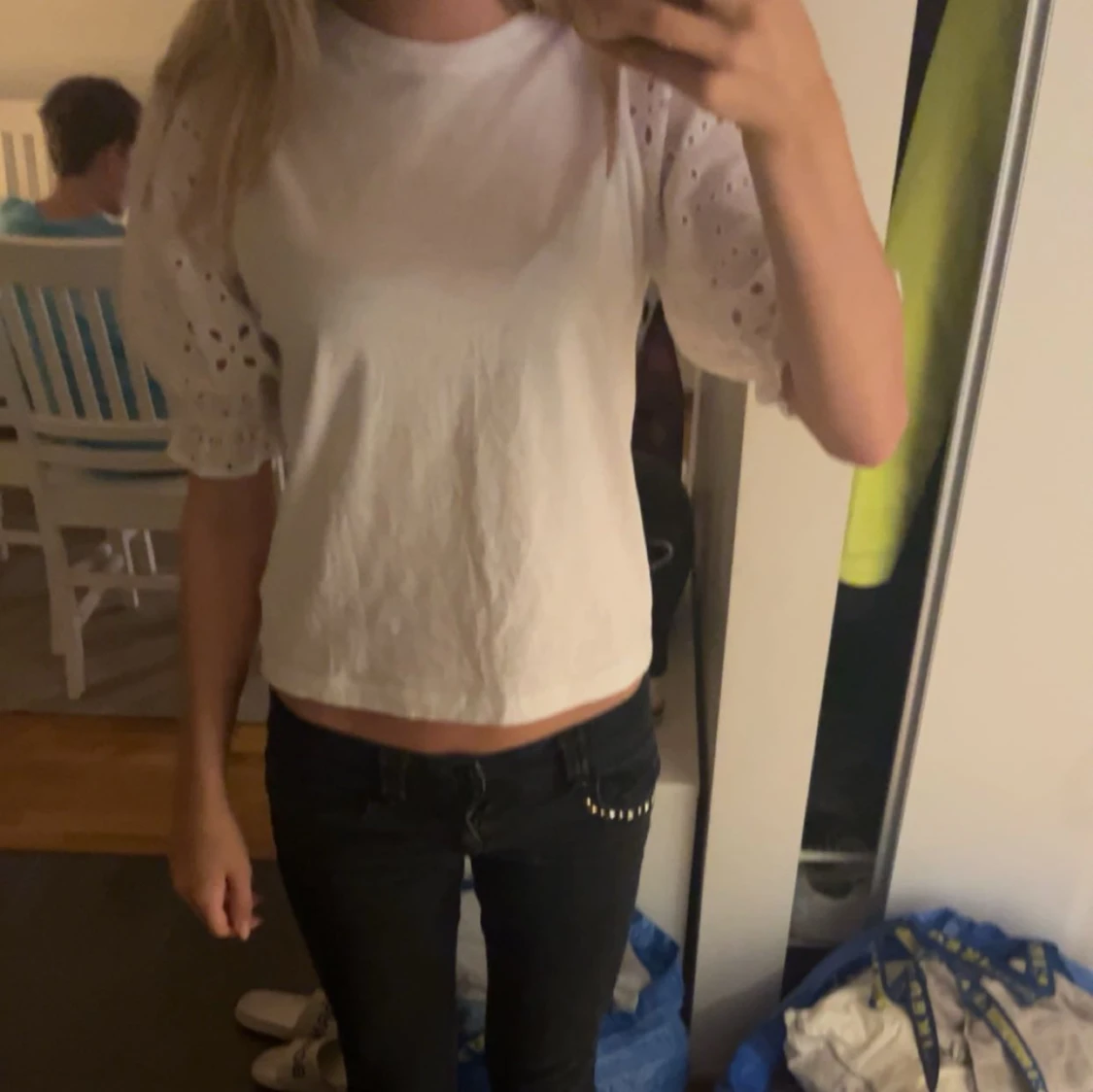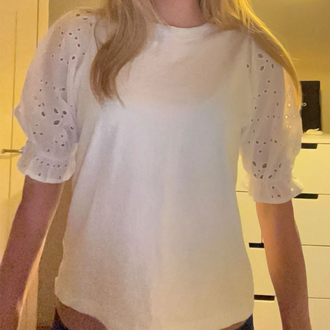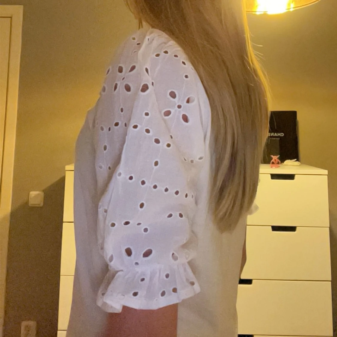 Säljer en superfin vit topp med puffärmar. Ärmarna har ett snyggt broderat mönster och är lite genomskinliga.