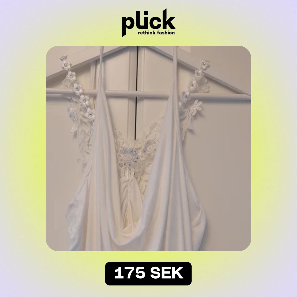 Säljer en superfin vit topp med vackra spetsdetaljer och gnistrande stenar.. Toppen har en draperad framsida och smala axelband. Den är i nyskick och passar perfekt till både jeans och kjol. Köpt i Italien. Storleksmärkt som M, men är mer S.