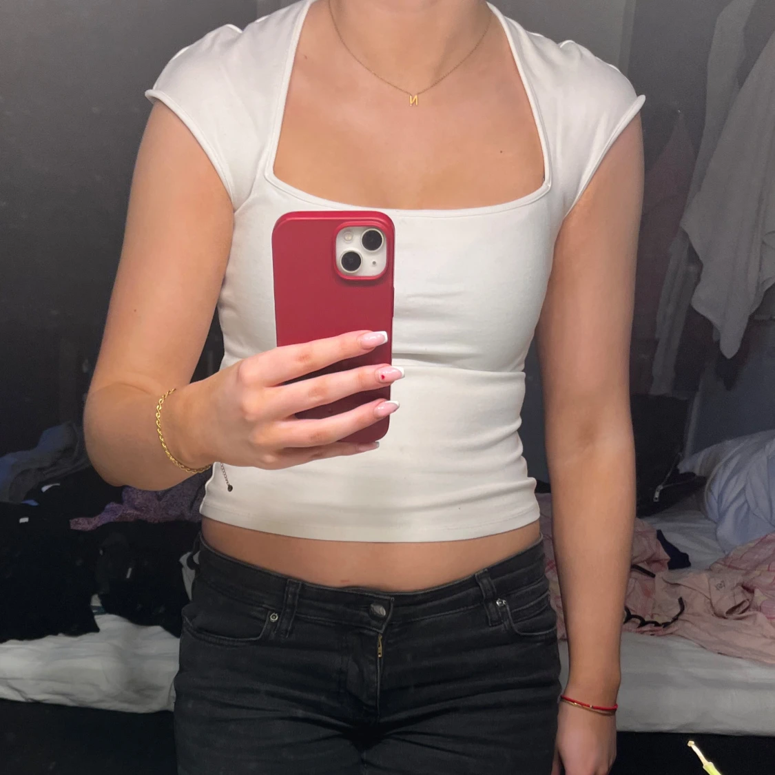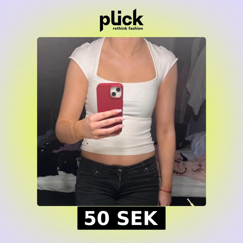 Säljer en vit topp med korta ärmar och fyrkantig halsringning. Storlek S❣️