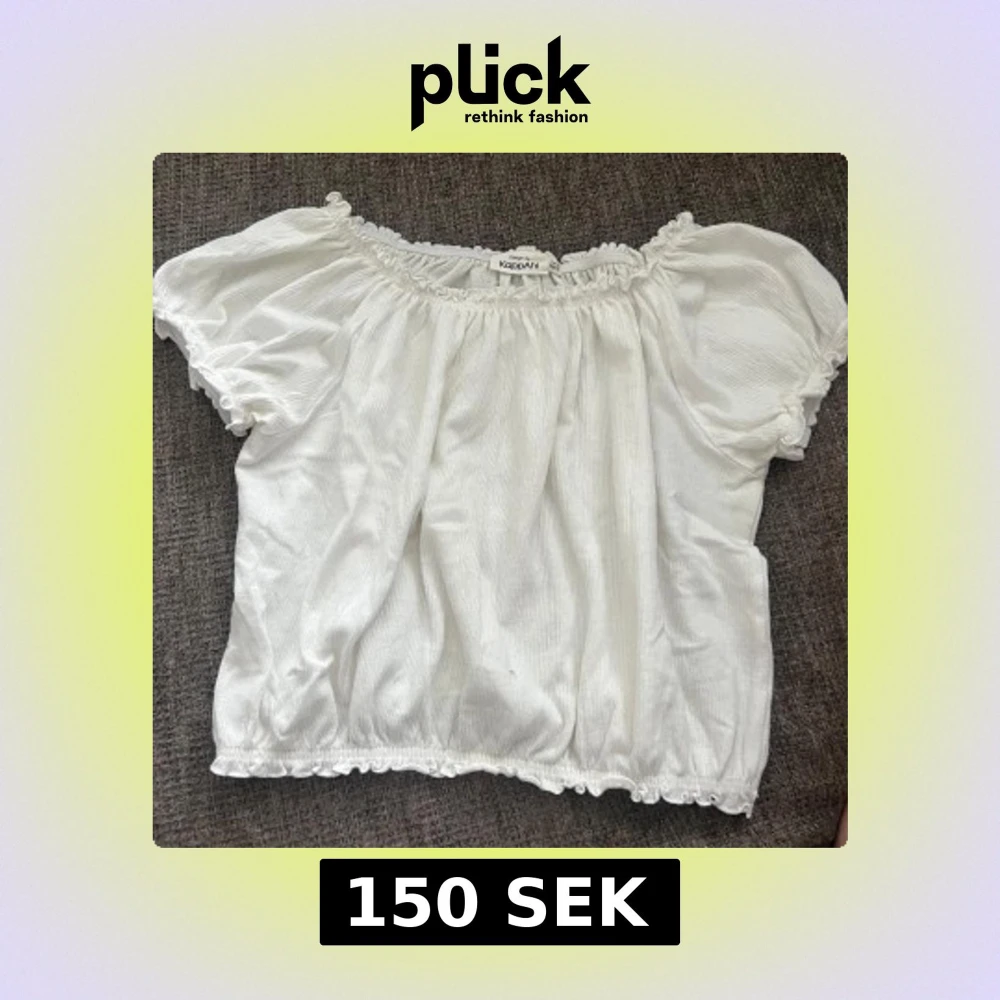 Söt vit offshoulder topp från KappAhl med korta puffärmar och resår vid halsringning och nederkant. Toppen har en lätt rynkad struktur och volangdetaljer längs kanterna. Perfekt för en somrig look!