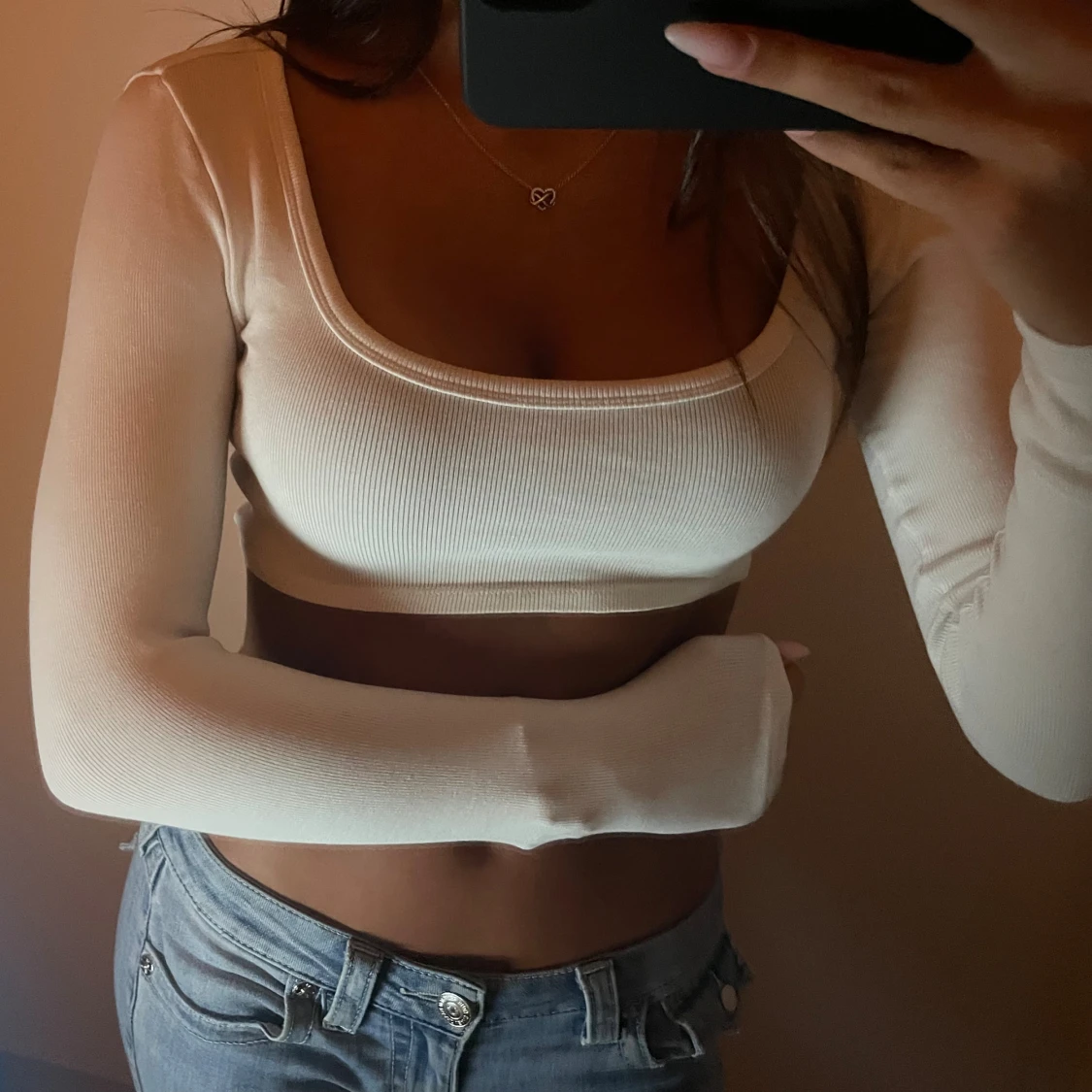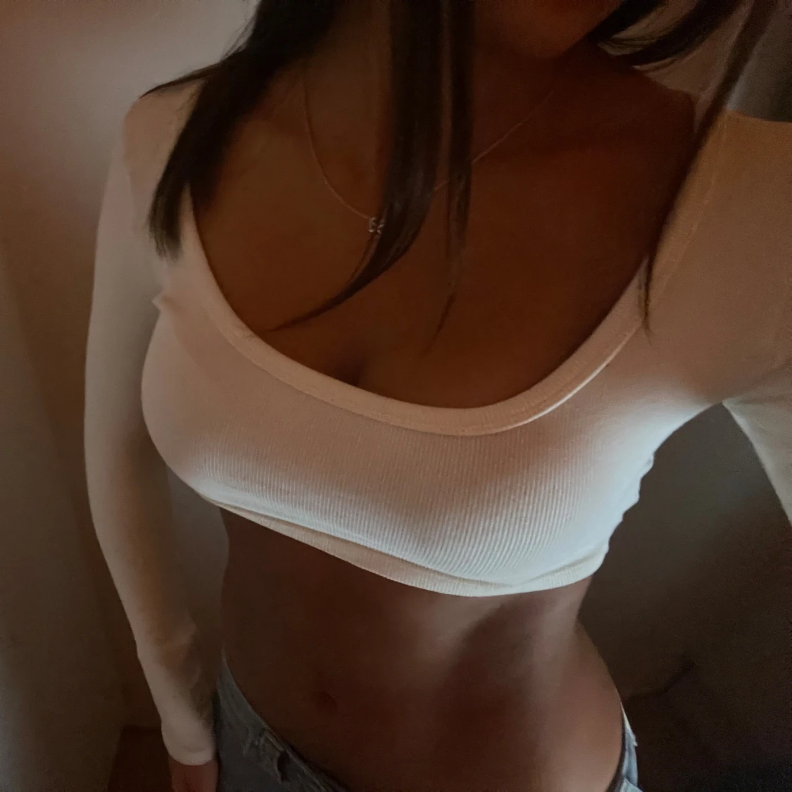 Säljer en vit croppad topp med lång ärm och rundad, djup urringning. Toppen är ribbad och sitter tight mot kroppen, perfekt att styla med jeans eller kjol. Materialet är stretchigt, vilket gör den bekväm att bära. Storlek S, sitter även som XS 🤍
