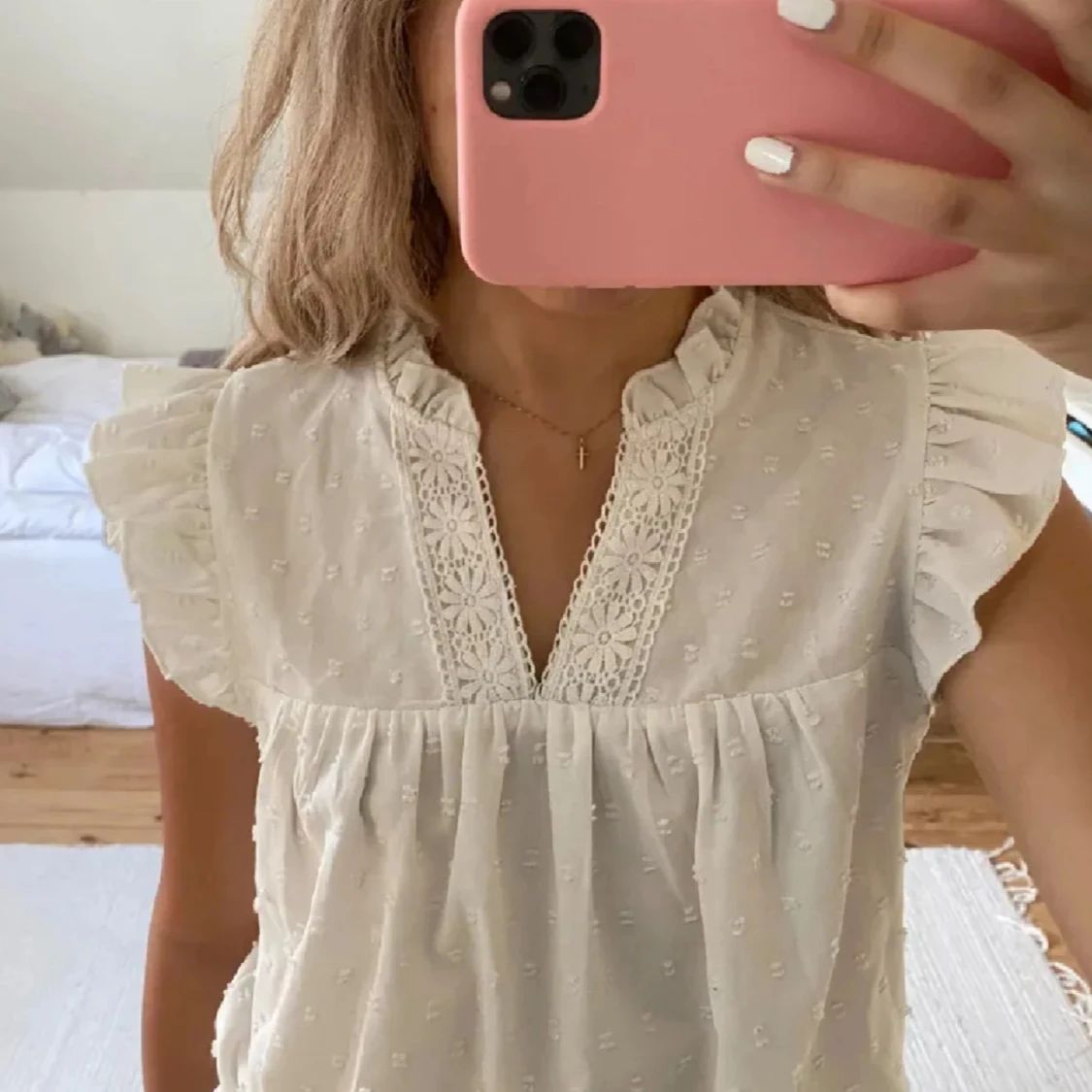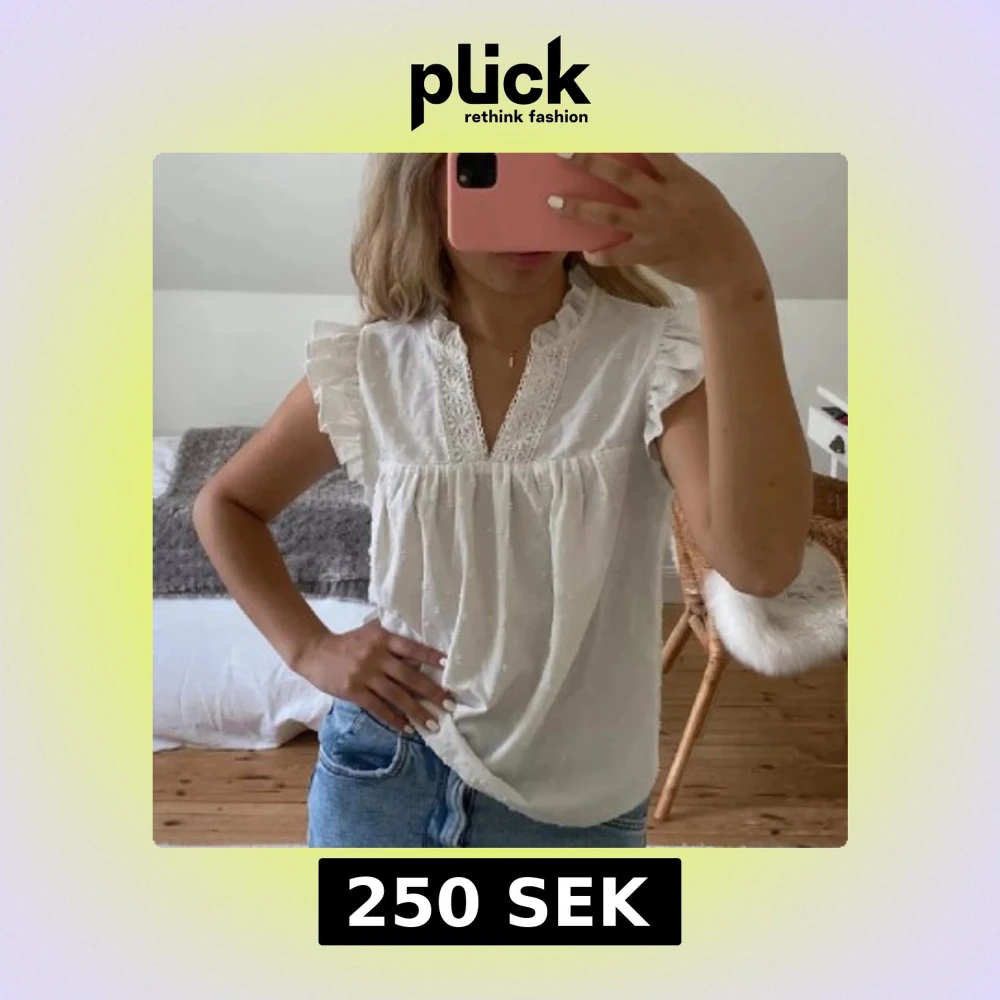 Supersöt vit topp med broderade detaljer, volangärmar och v-ringning med spetskant. Blusen har små diskreta prickar i tyget. Lånade bilder.
