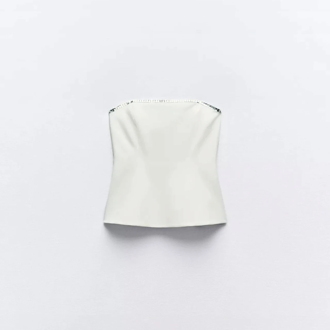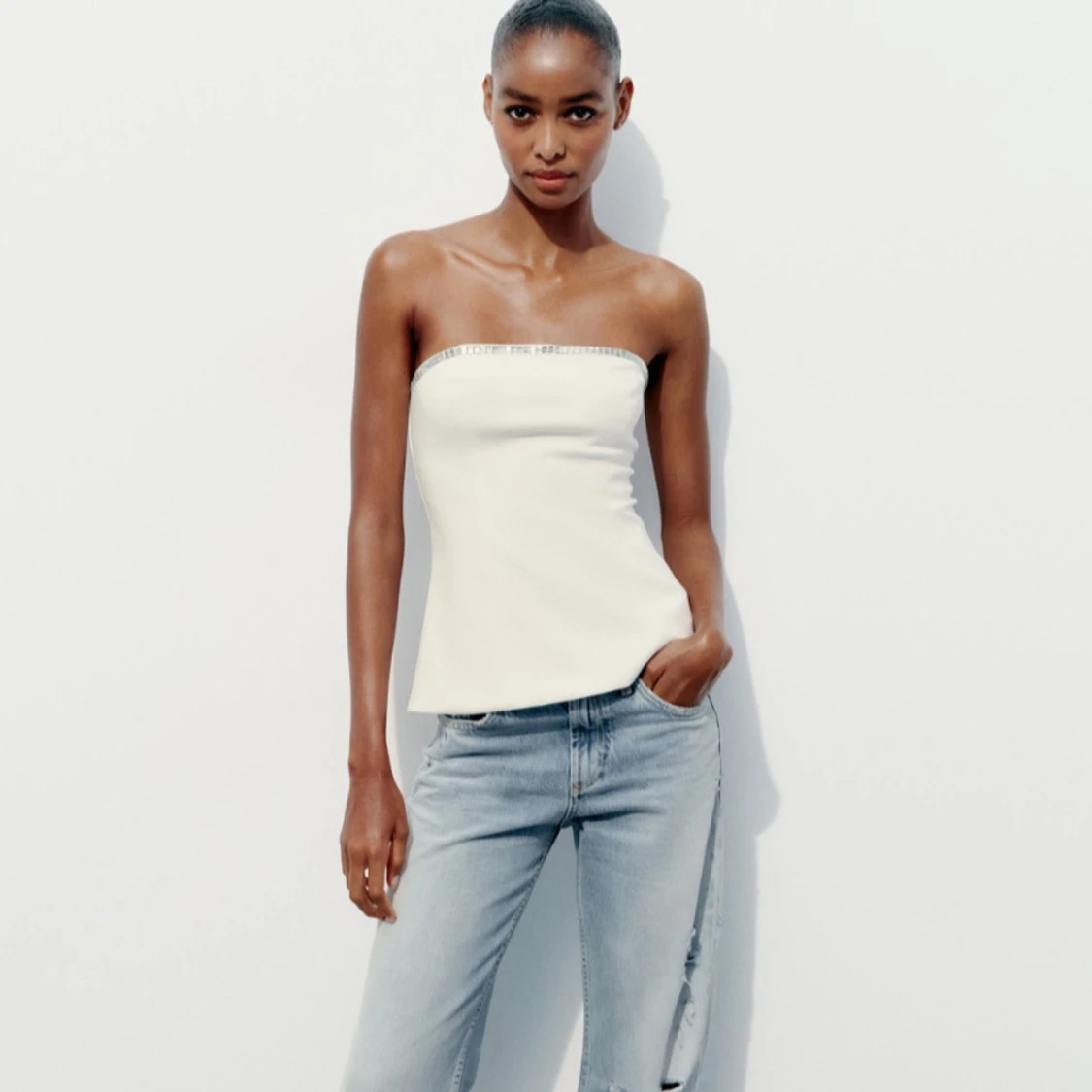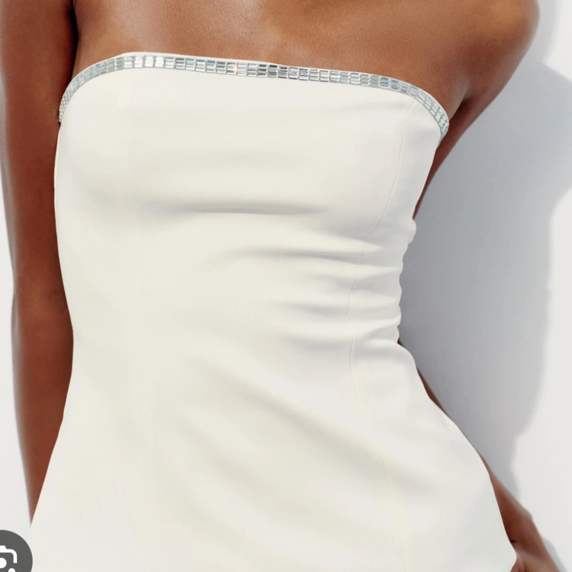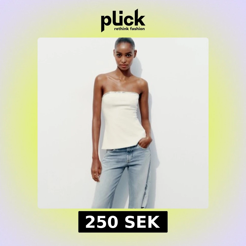 Såå snygg vit tubtopp med en glittrig kant upptill från Zara. Den är helt oanvänd och har inga defekter. En perfekt topp nu till våren och sommaren! Skriv gärna till mig om du har några funderingar eller liknande💕💕🤍🌟