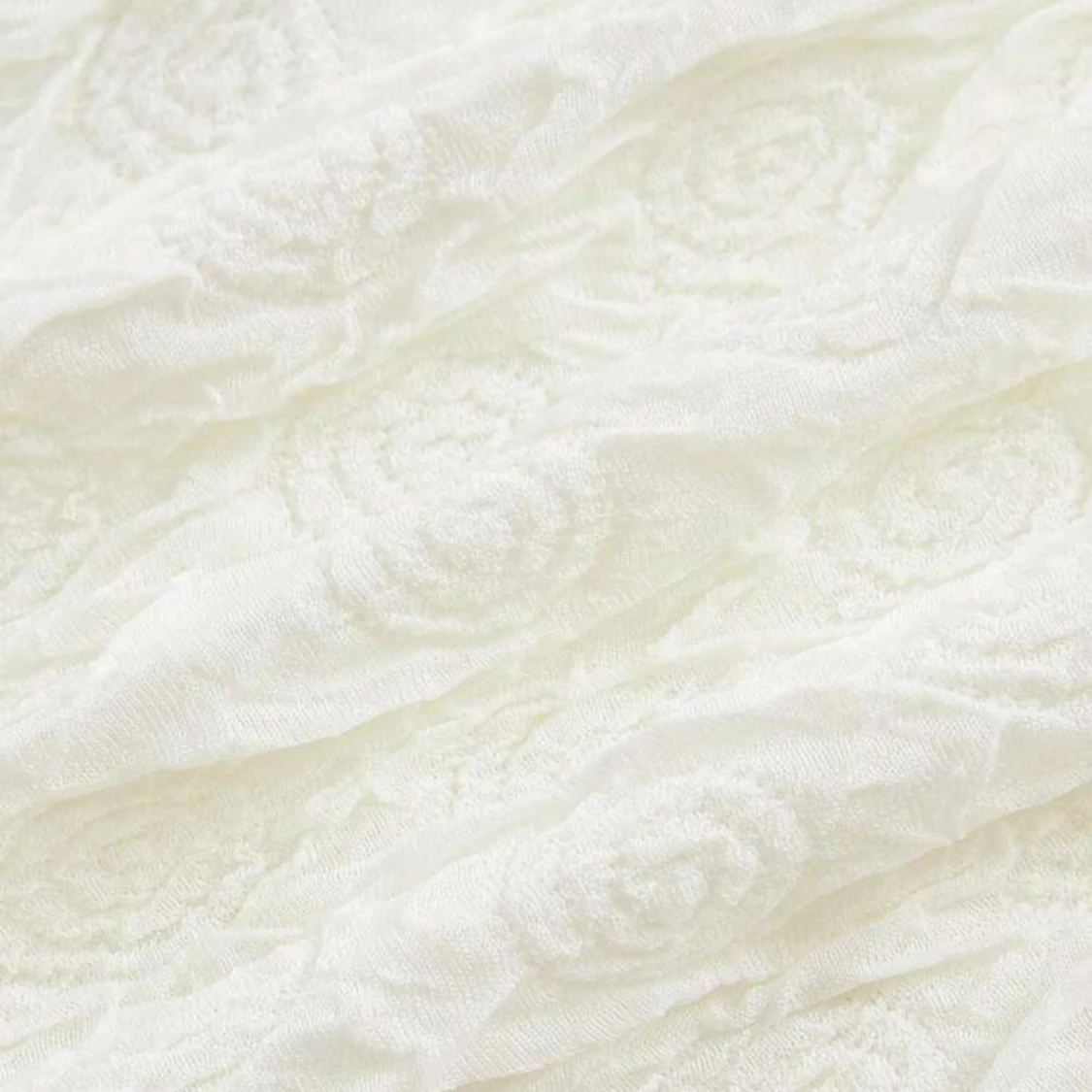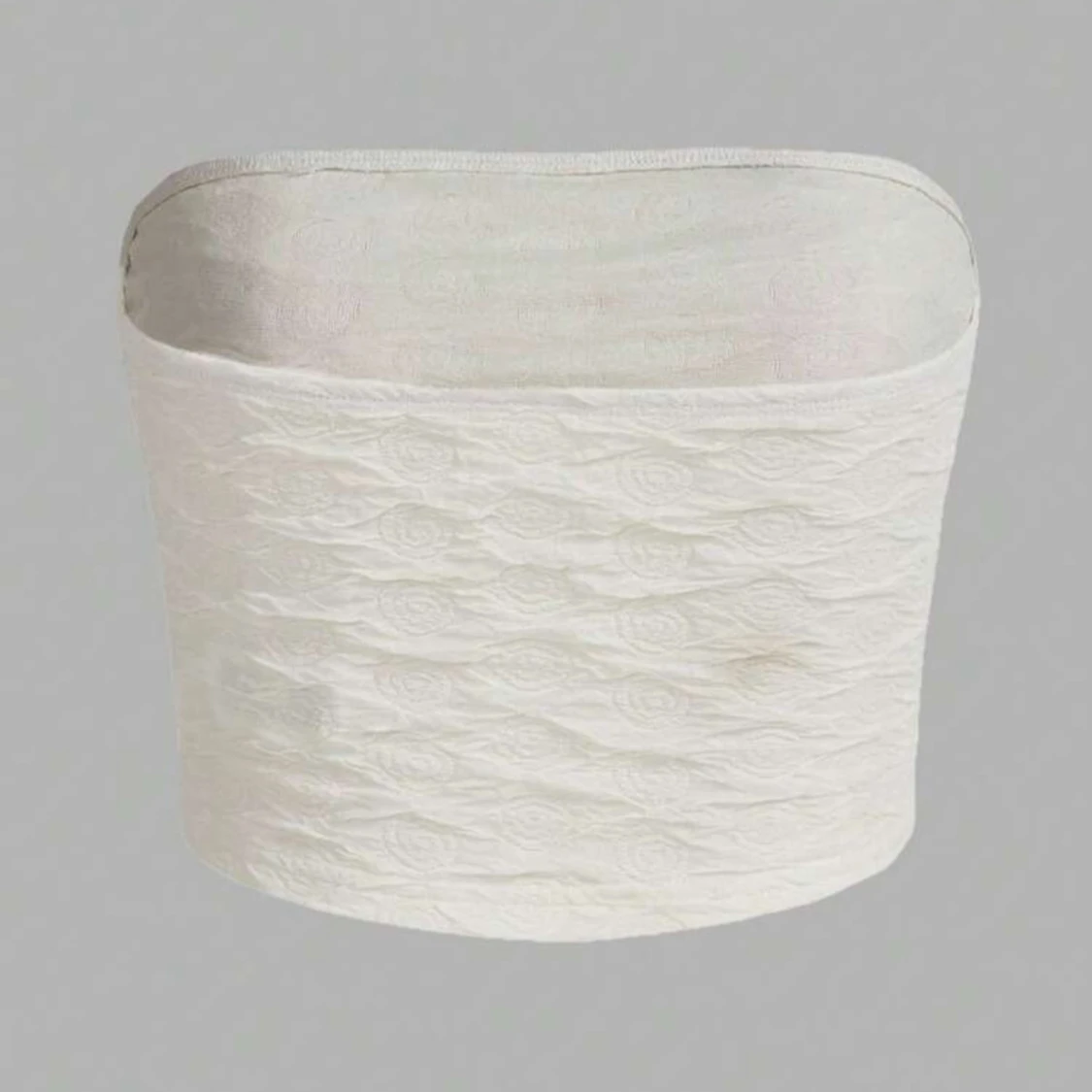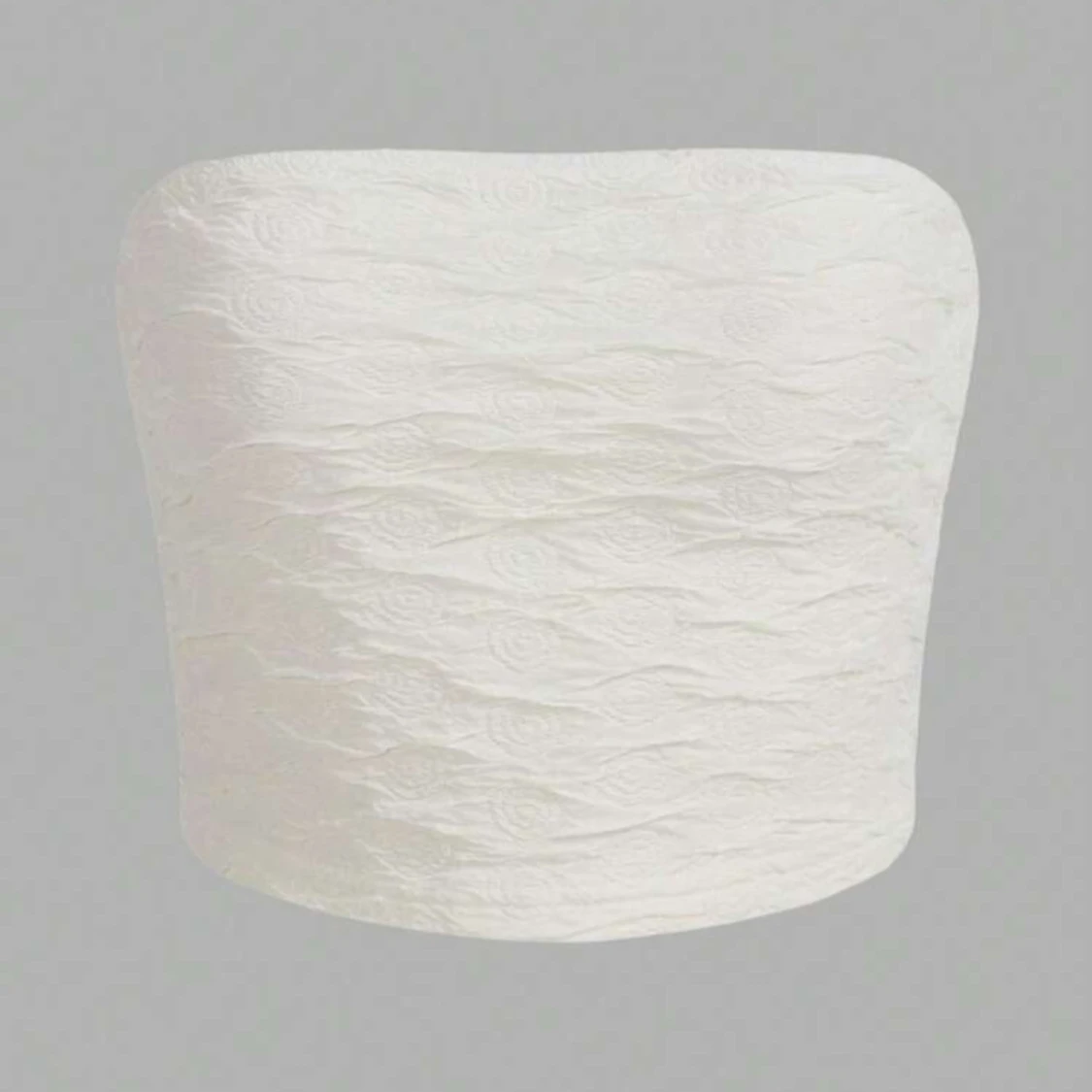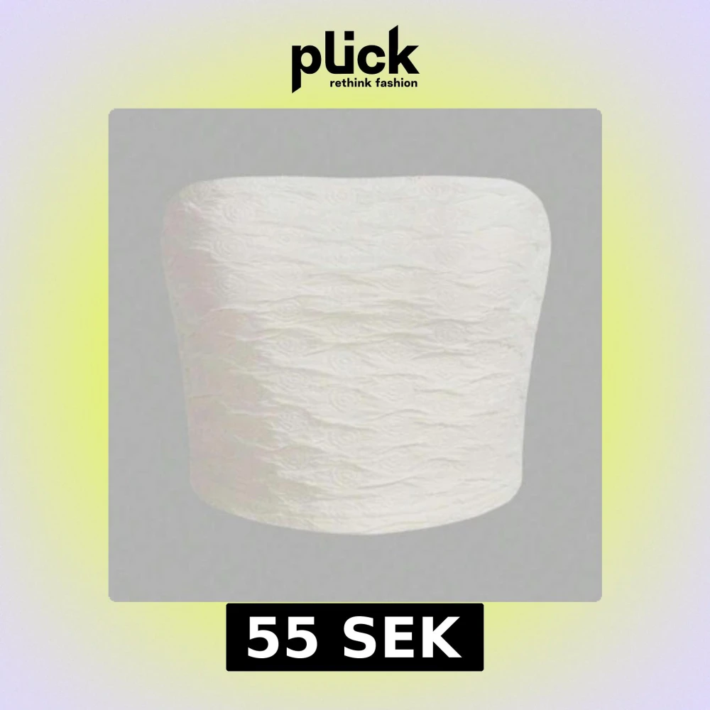 Säljer en vit tubtopp med vackert strukturmönster i tyget. Toppen är ärmlös och har en lätt vågig yta med diskreta mönsterdetaljer. Perfekt att styla till olika outfits.