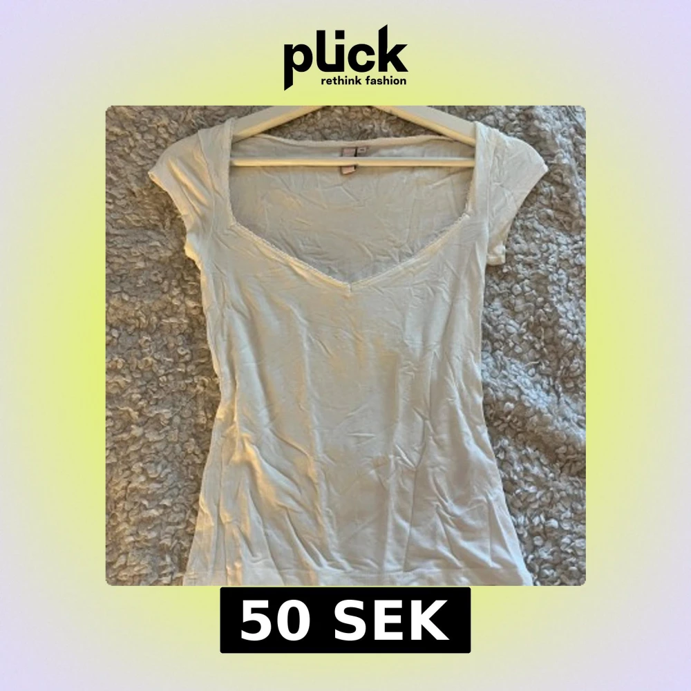 Vit T-shirt med spets kant runt v-ringningen från Nelly, använd ett fåtal gånger. Skriv om du skulle önska fler bilder😁😁