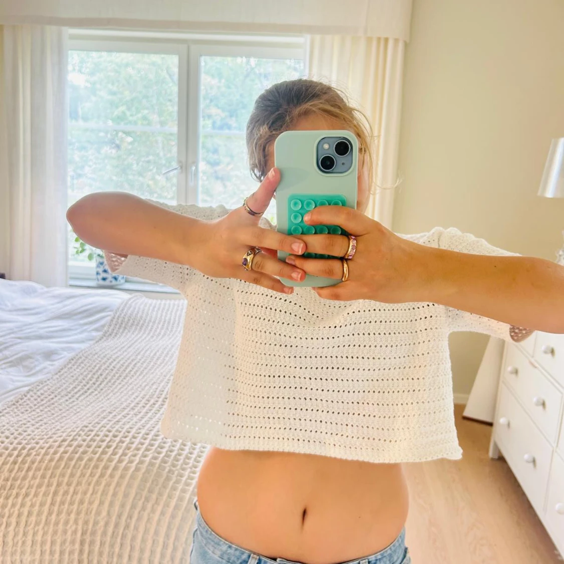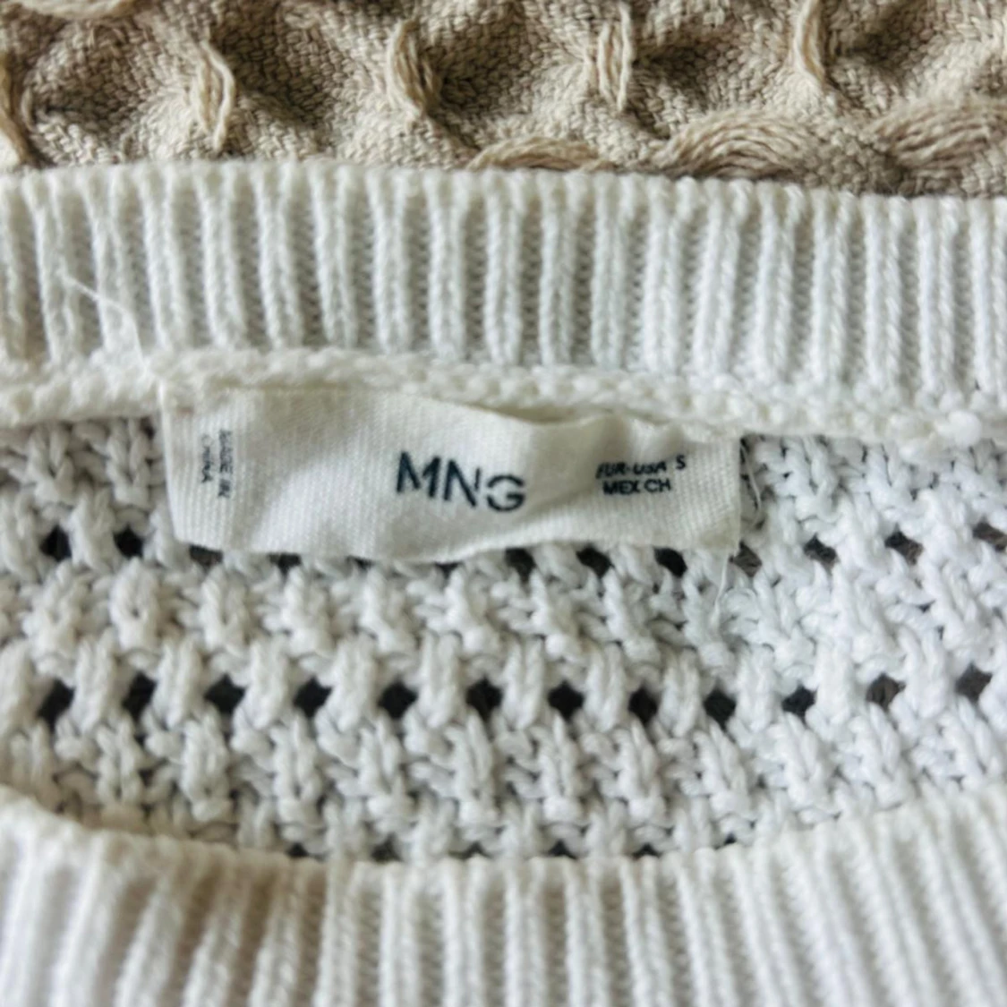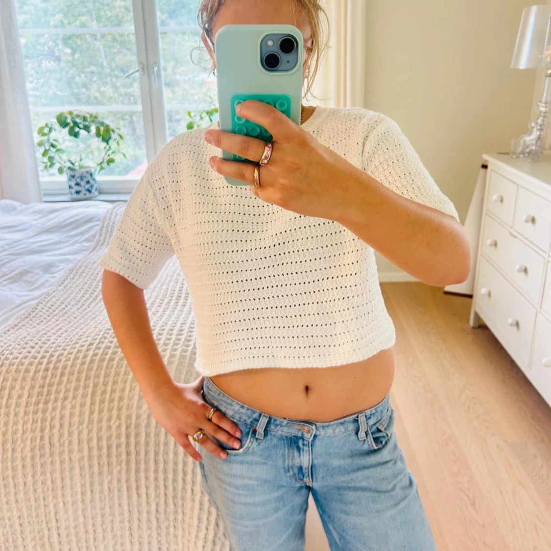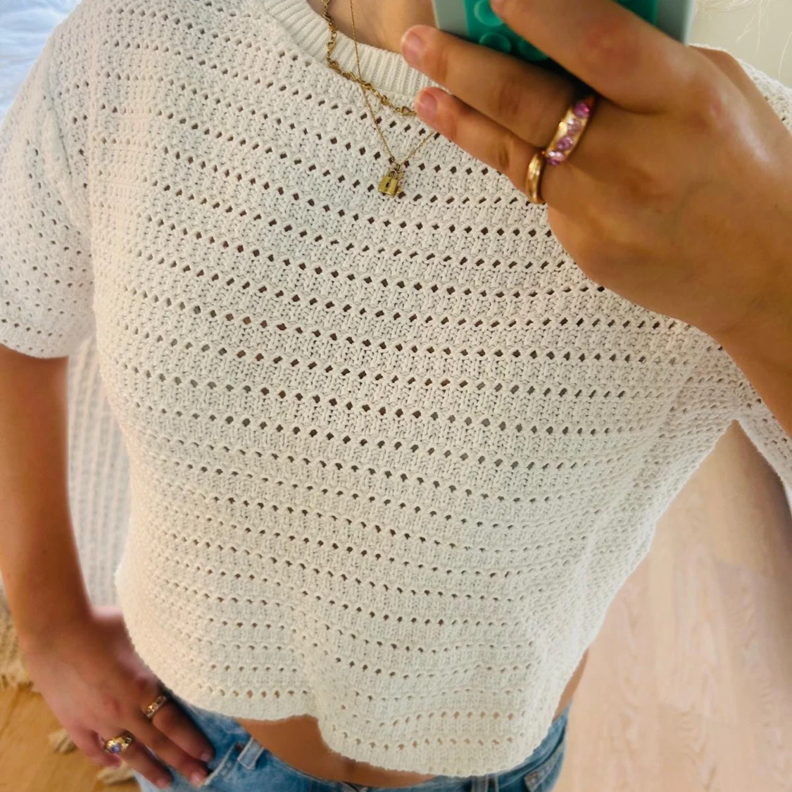 Superfin vit croppad topp i virkad stil med korta ärmar och rund hals 💕inga trasiga hål och inga fläckar, Toppen har ett luftigt, stickat mönster och passar perfekt till jeans eller tjol💕. Det står XS men funkar också som S!