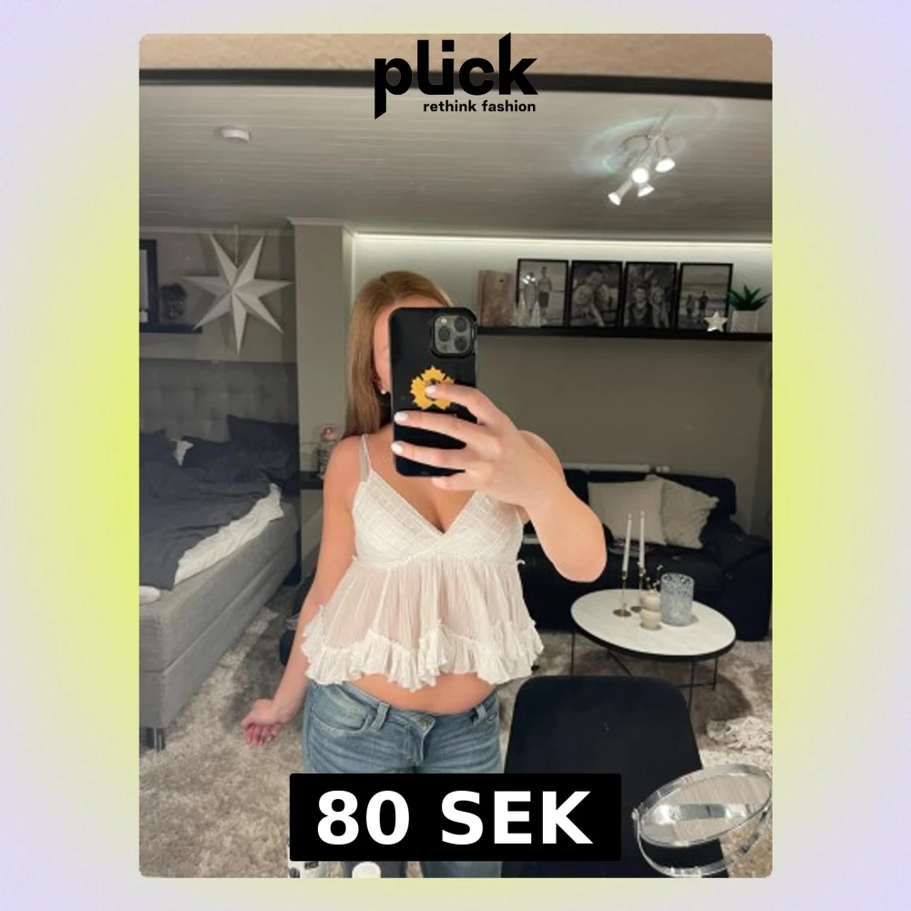 Supersöt vit linnetopp med smala axelband och v-ringad hals. Toppen har volanger nedtill och ett luftigt, flowy tyg som ger en romantisk vibe. Perfekt till jeans eller kjol när du vill ha en chill och feminin look.