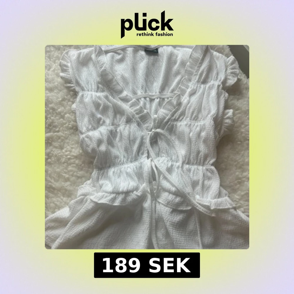 Supersöt vit blus från Gina Tricot i storlek XS. Toppen har volangdetaljer, v-ringning och knyt framtill. Den är ärmlös och har en lätt strukturerad bomullskänsla. Perfekt för en fräsch och somrig look!