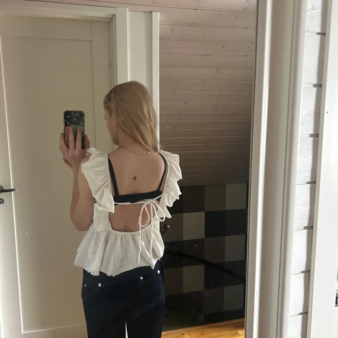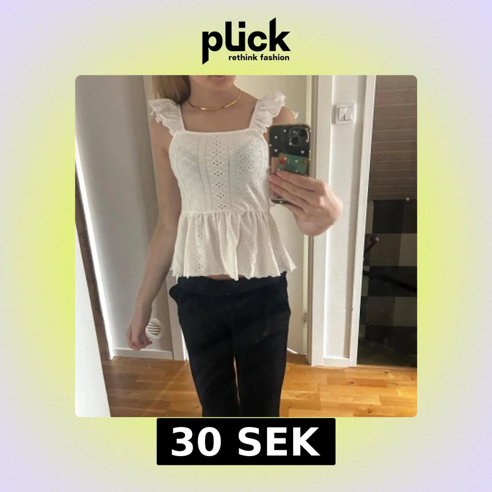 Supersöt vit blus med volangaxlar och broderade detaljer. Toppen har fyrkantig ringning, peplum-nederdel och öppen rygg med knytband. Perfekt för varma dagar och ger en romantisk vibe.