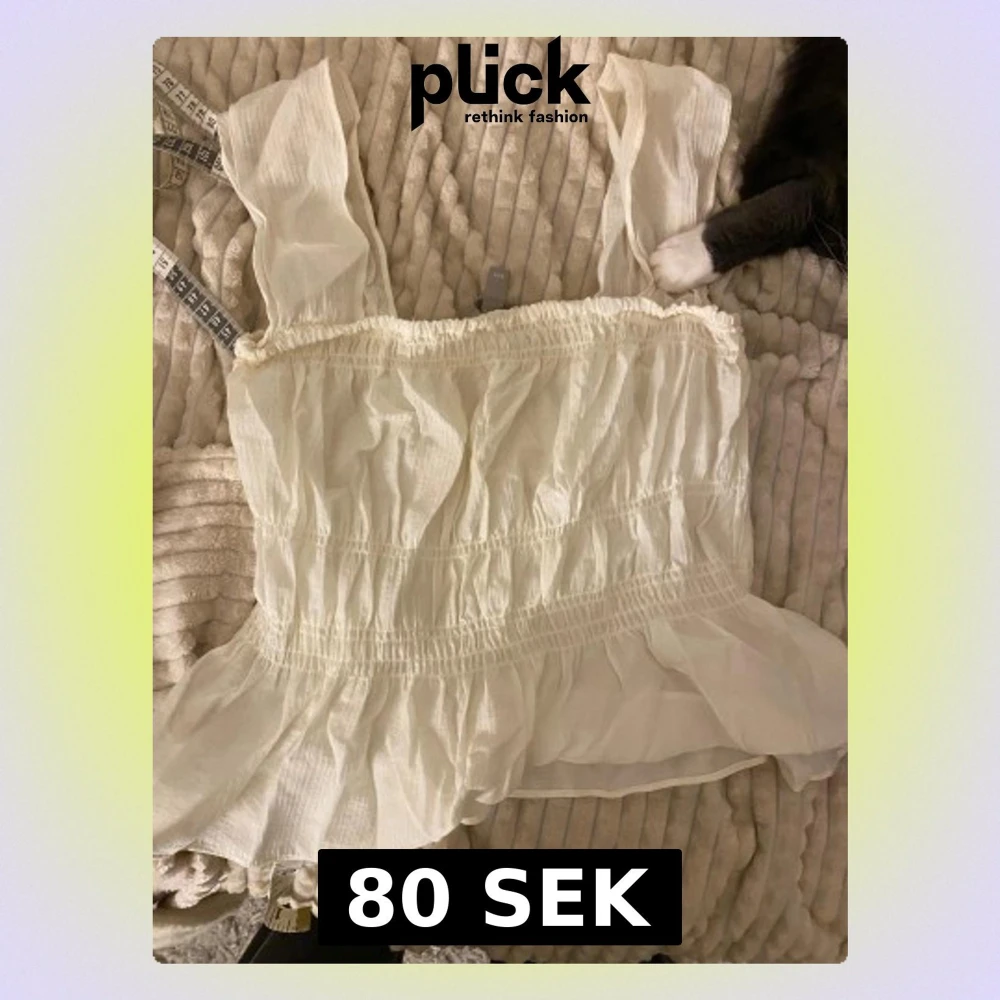 Supersöt vit linnetopp från H&M i storlek XS. Toppen har breda axelband, smockad överdel och volangig nederkant. Luftigt och lätt material som passar perfekt till varma dagar. Enkel och stilren design som är lätt att matcha.