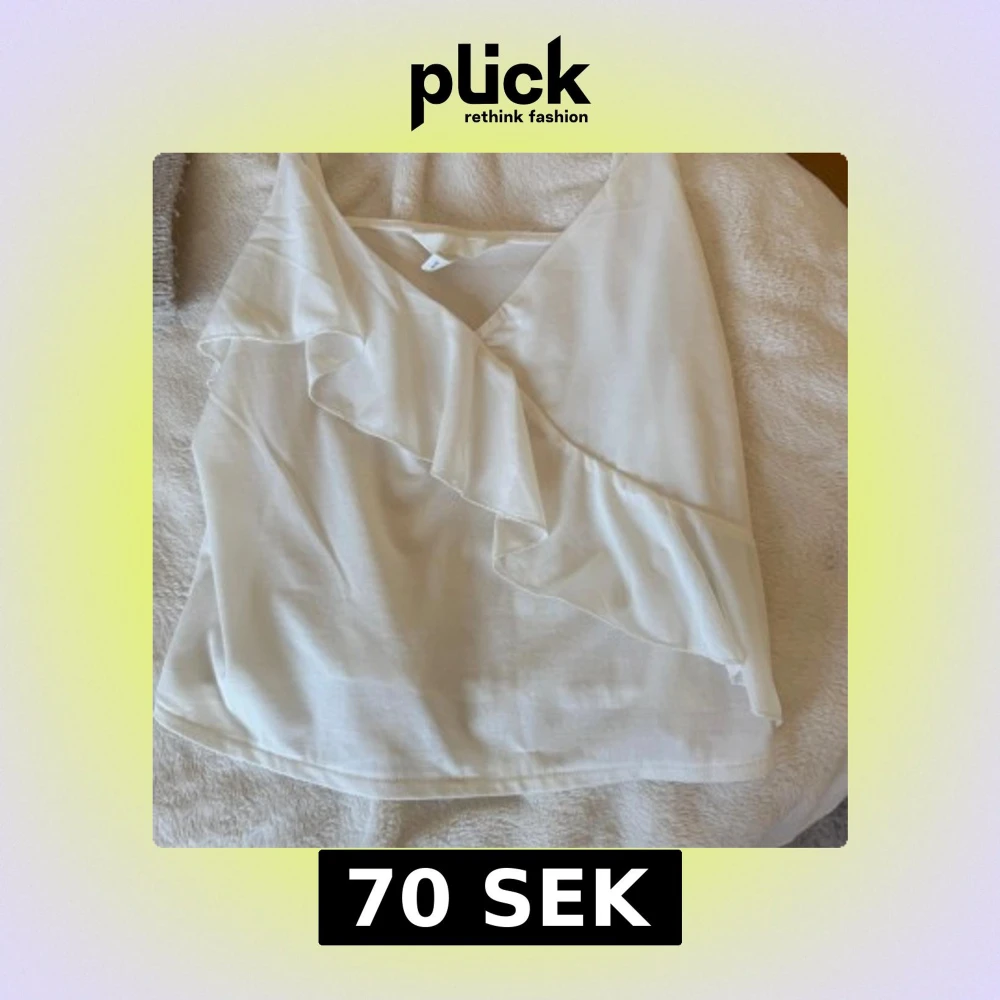 Säljer en vit linnetopp från H&M med smala axelband och snygg omlottvolang framtill. Toppen har v-ringning och är tillverkad i ett lätt och mjukt material som känns skönt mot huden. Perfekt för en fräsch och stilren look.