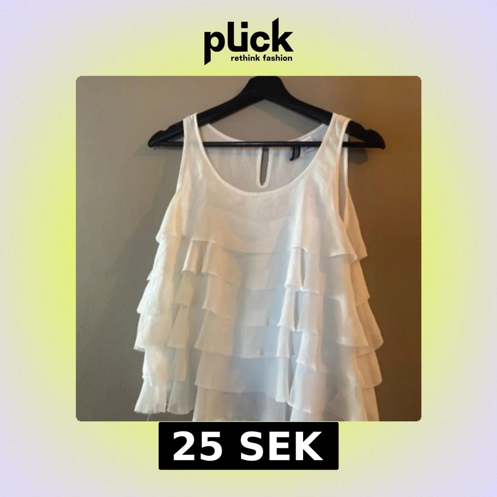 Säljer en vit ärmlös topp med flera lager volanger. Toppen har rund halsringning och är tillverkad i ett lätt, luftigt material som passar perfekt till sommaren. Den har fransat sig lite vid kanterna därför säljer jag den billigt.