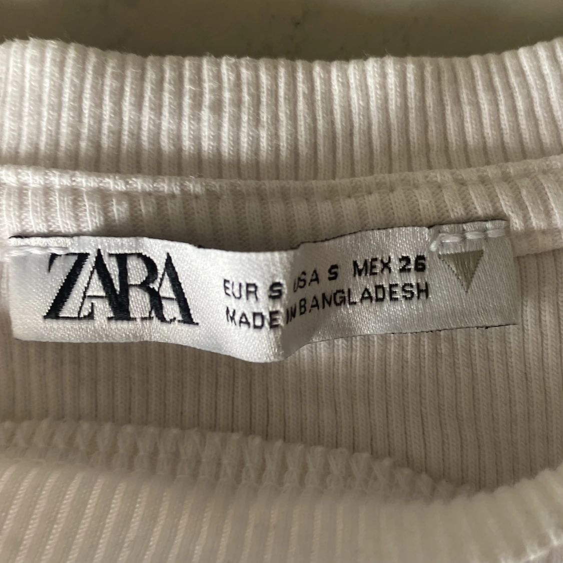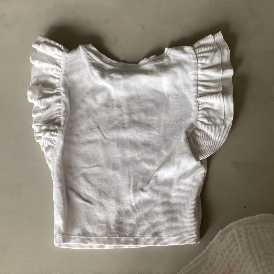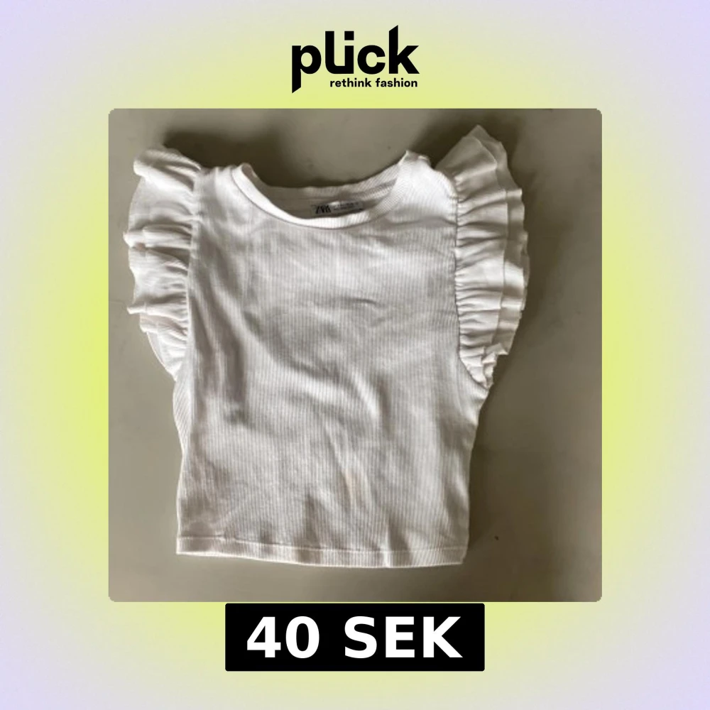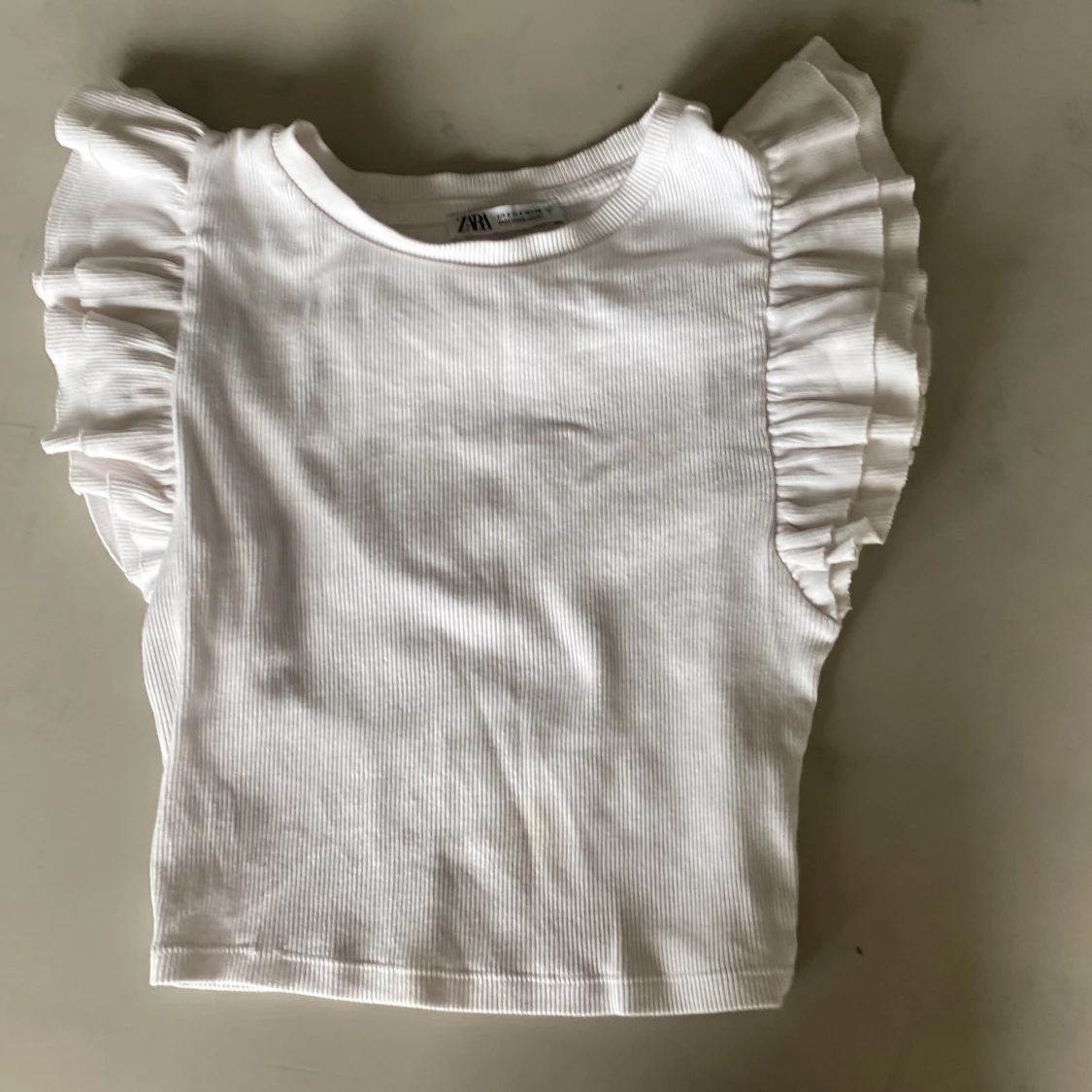 Supersöt vit topp från Zara med volangdetaljer på axlarna. Toppen är ribbad och har en rak, croppad passform. Perfekt för dig som gillar en feminin och trendig stil. Tillverkad i mjuk bomull som känns skön mot huden.