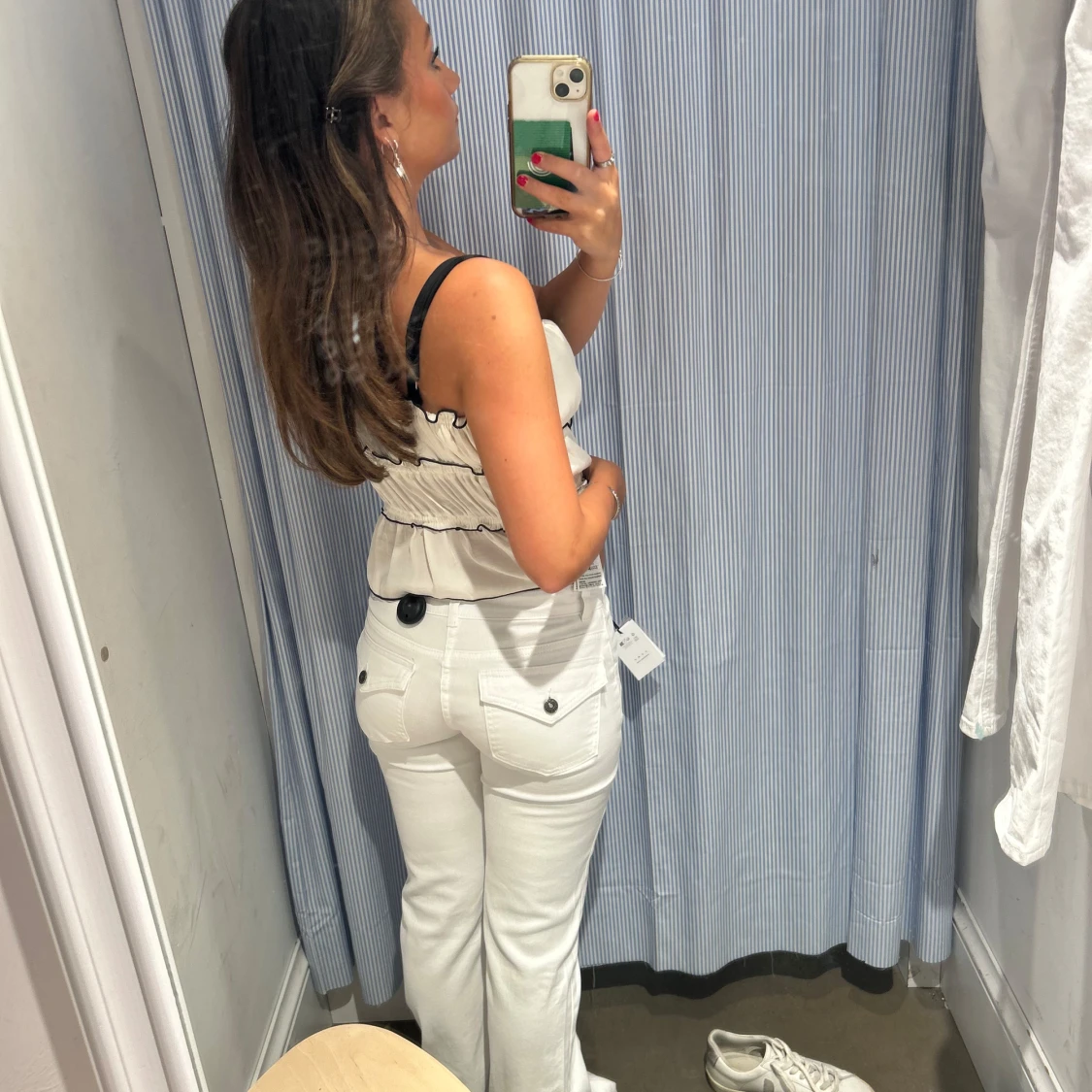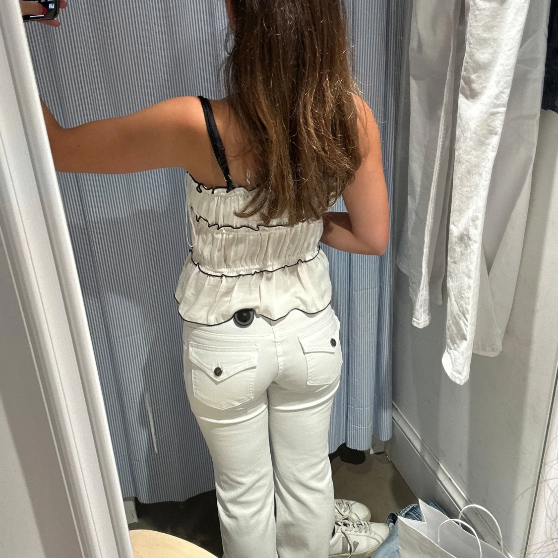 Supersöt vit topp med volanger och svarta kontrastsömmar. Toppen har smala axelband och flera svarta knytband framtill som ger en cool detalj. Perfekt för dig som gillar en feminin och trendig stil.