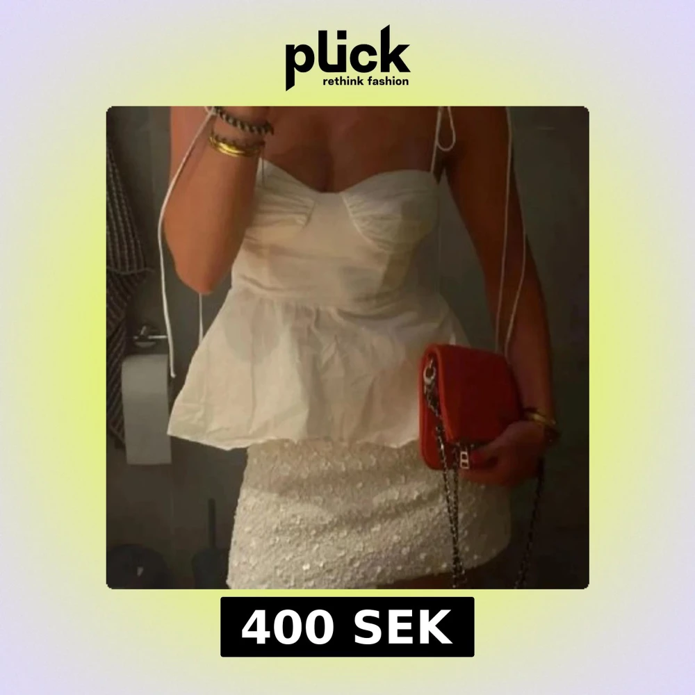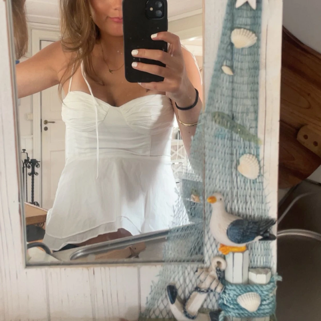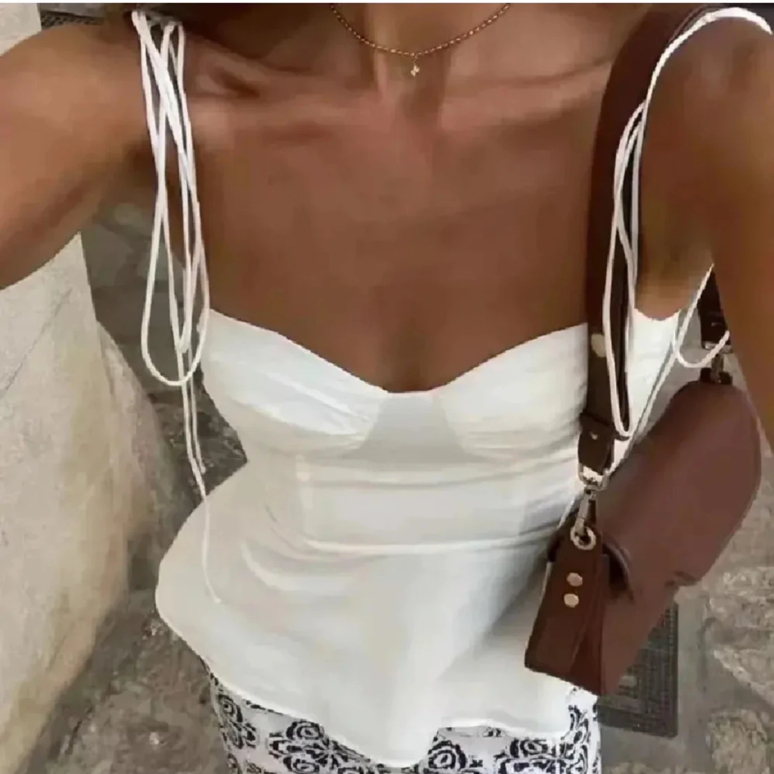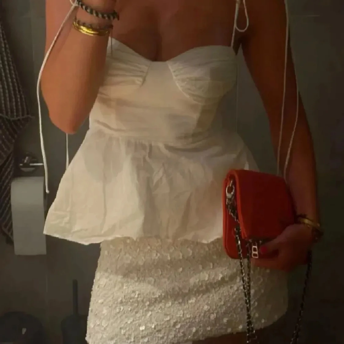 Supersöt vit topp med tunna axelband som knyts på axlarna. Toppen har en figurnära passform upptill och en lätt utsvängd peplum nedtill. Perfekt till jeans eller kjol för en trendig look.