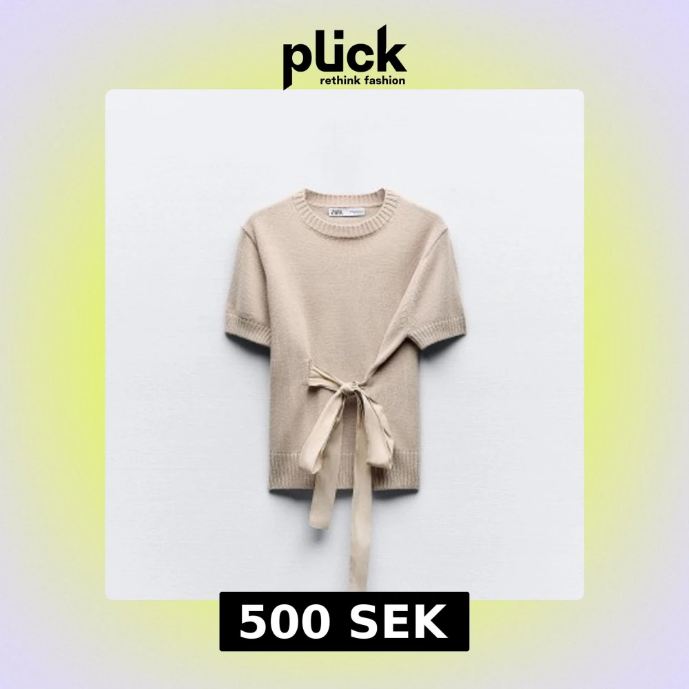 Superfin beige stickad topp från Zara med korta ärmar och rund hals. Toppen har en snygg knytdetalj i midjan som ger en unik look. Perfekt att styla med jeans eller kjol för en trendig outfit.