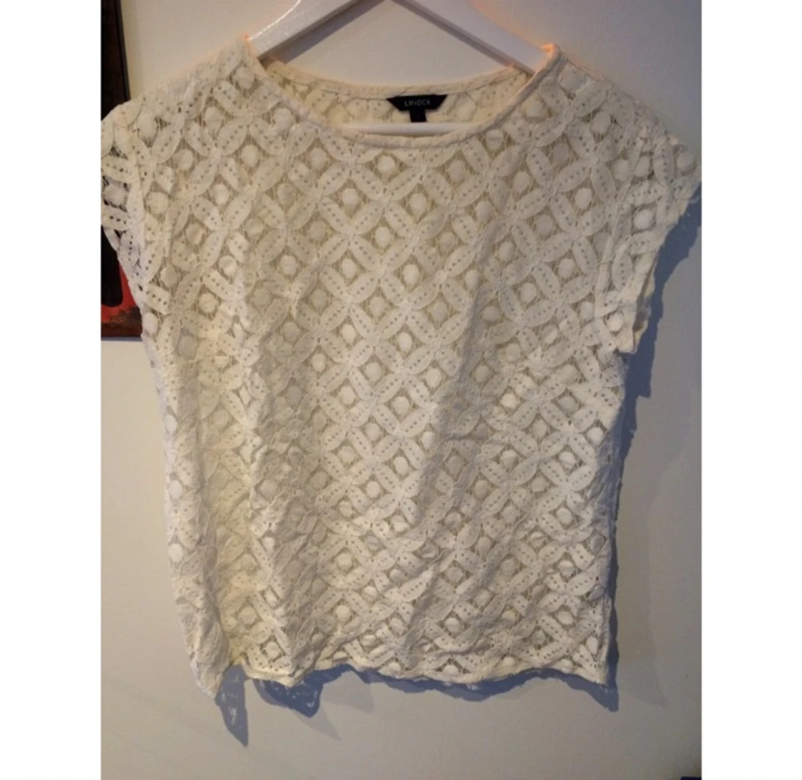 Vit spetstopp från Lindex. Transparent, syns på en av bilderna där jag håller min hand bakom tyget. Passar S eller M.