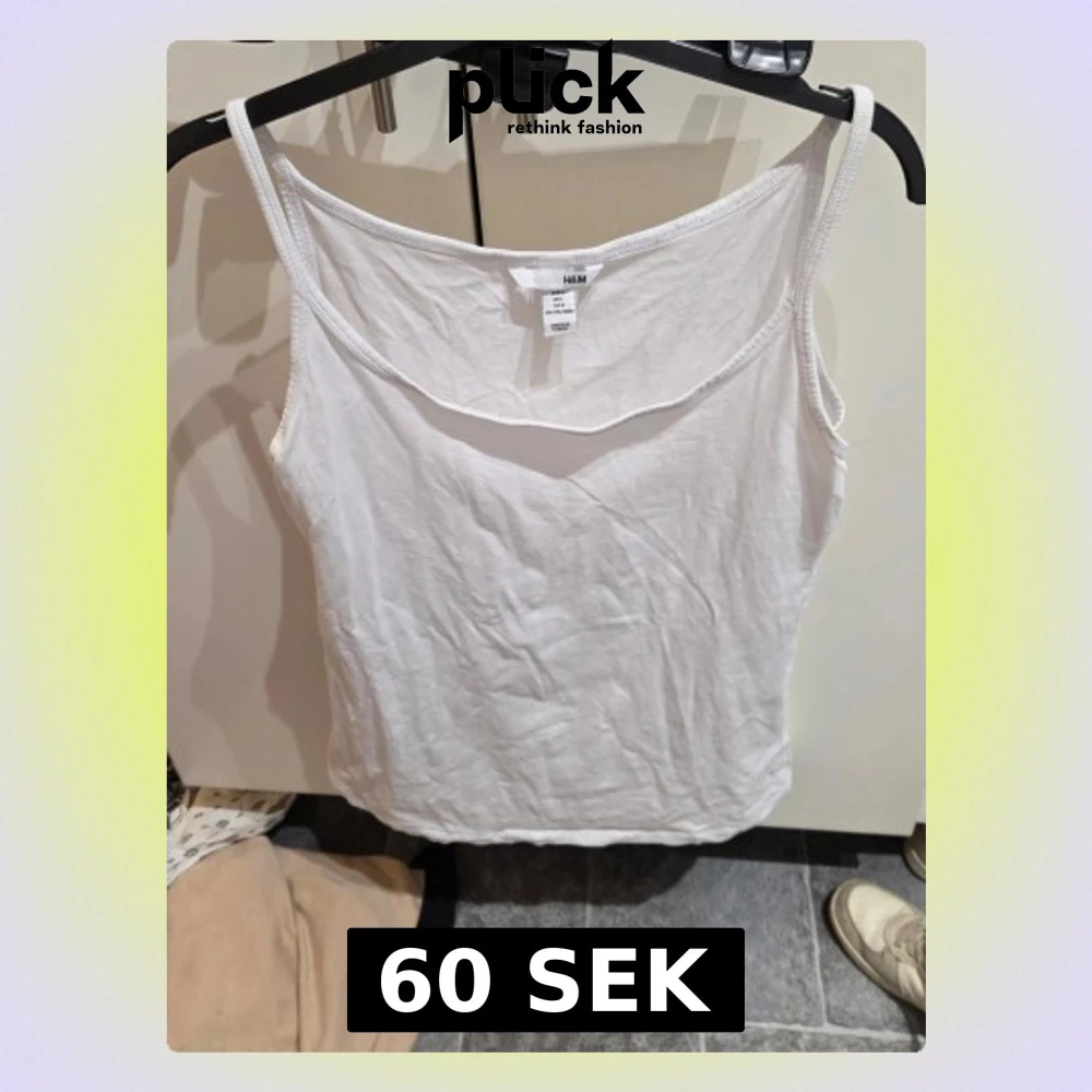 Säljer en enkel och stilren vit linnetopp från H&M i storlek L. Toppen har smala axelband och är tillverkad i mjuk bomull med lite stretch för skön passform. Perfekt att matcha med jeans eller shorts under varma dagar.