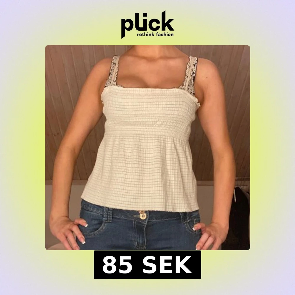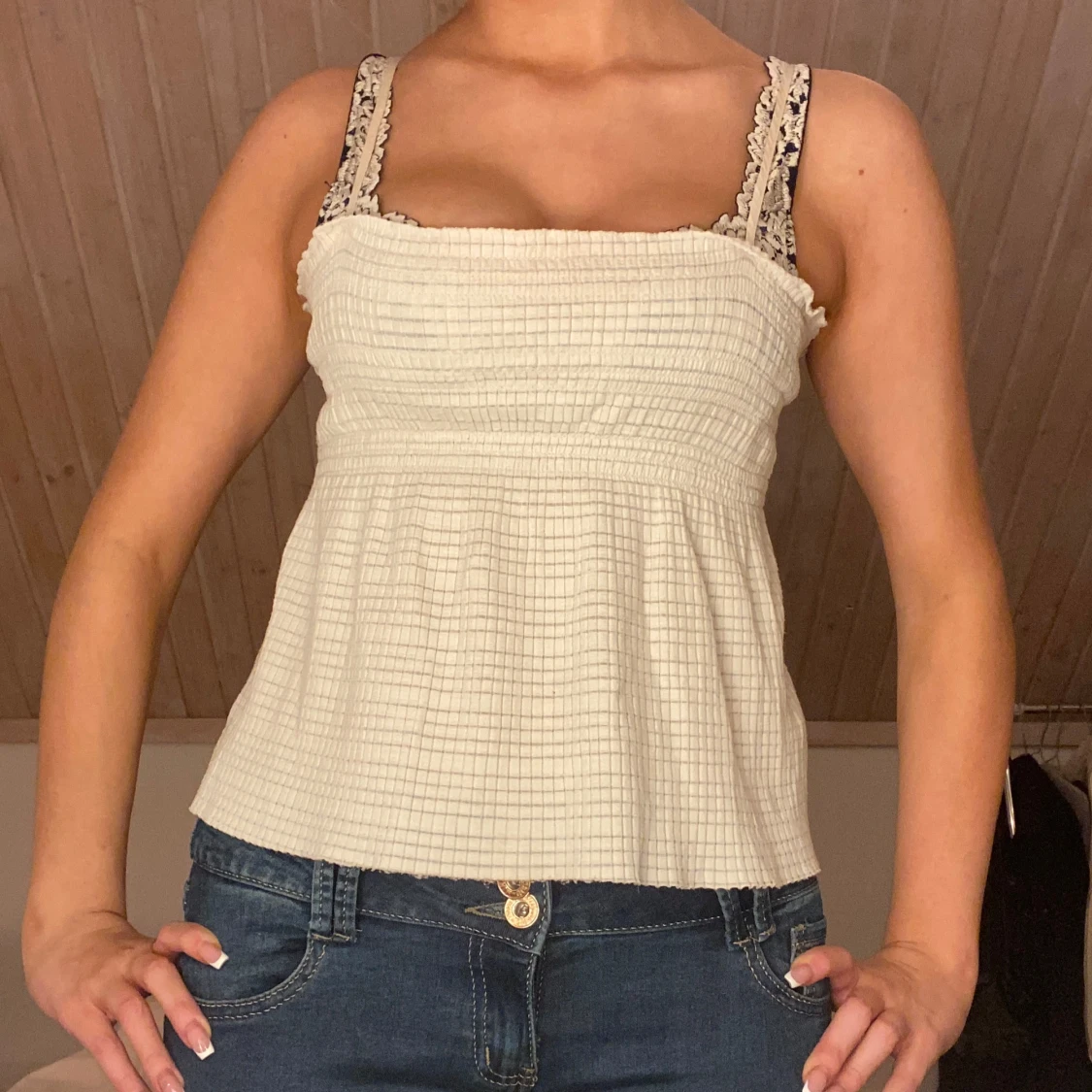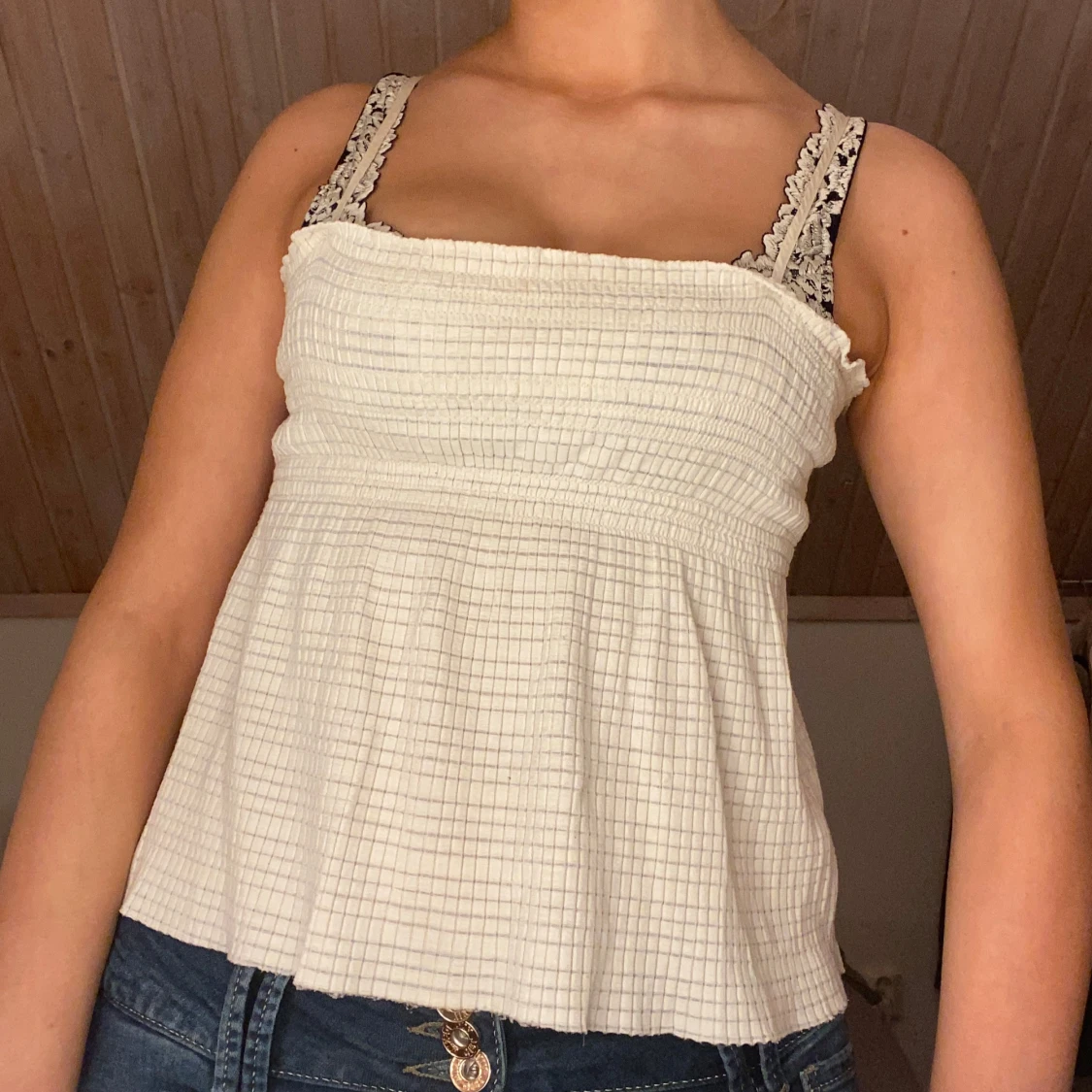 Säljer ett sött vitg linne med smockad överdel. Perfekt för varma sommardagar. Linnet har en avslappnad passform och är tillverkat i ett lätt material.