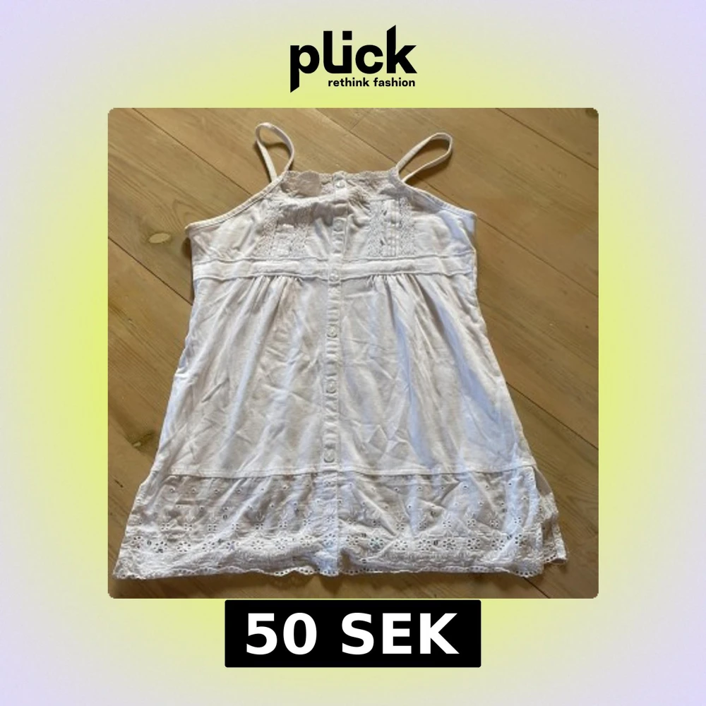 Super sött vitt linne med tunna axelband, knappar framtill och broderade spetsdetaljer upptill och längs fållen. Storlek 146/152 dvs likt en xxs!☺️☺️