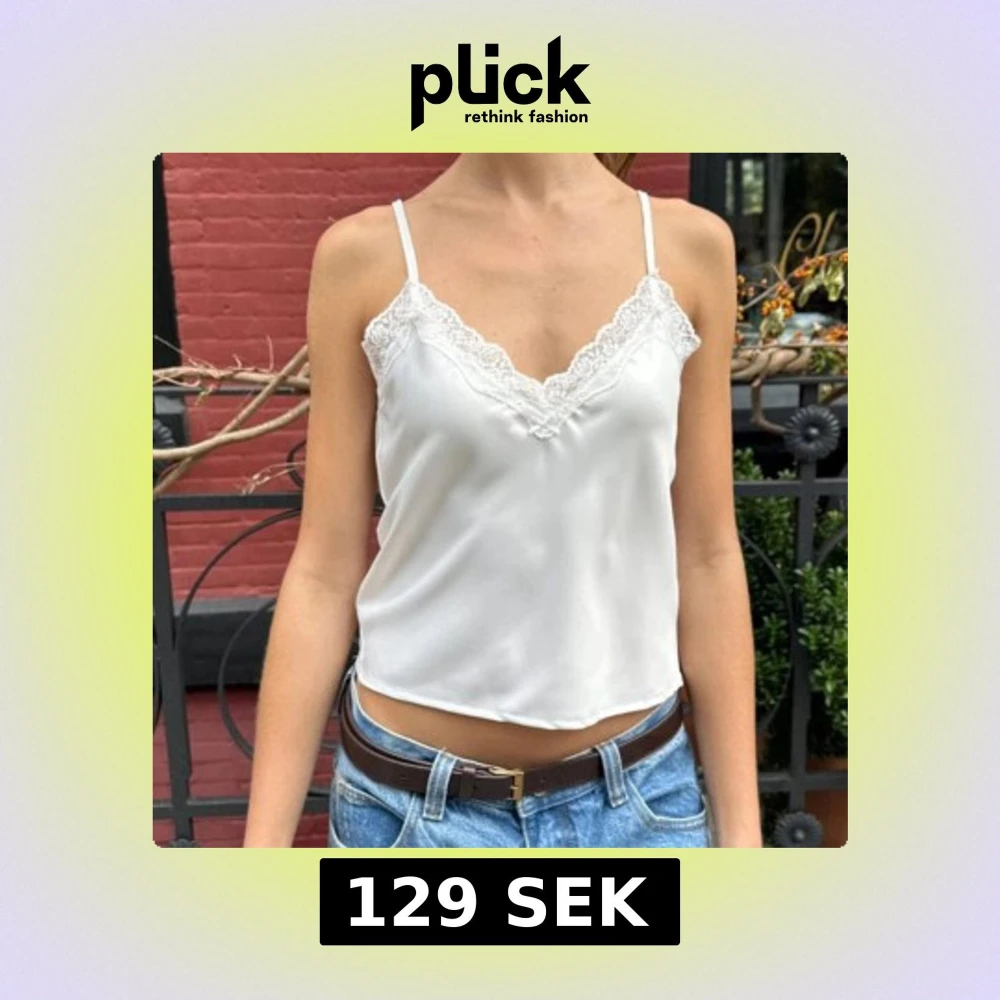 säljer ett vitt linne från brandy melville med spetsdetaljer längs halsringningen. linnet har jättemjukt & glansigt tyg🫶🏻🤍 (ord. pris: 265kr)