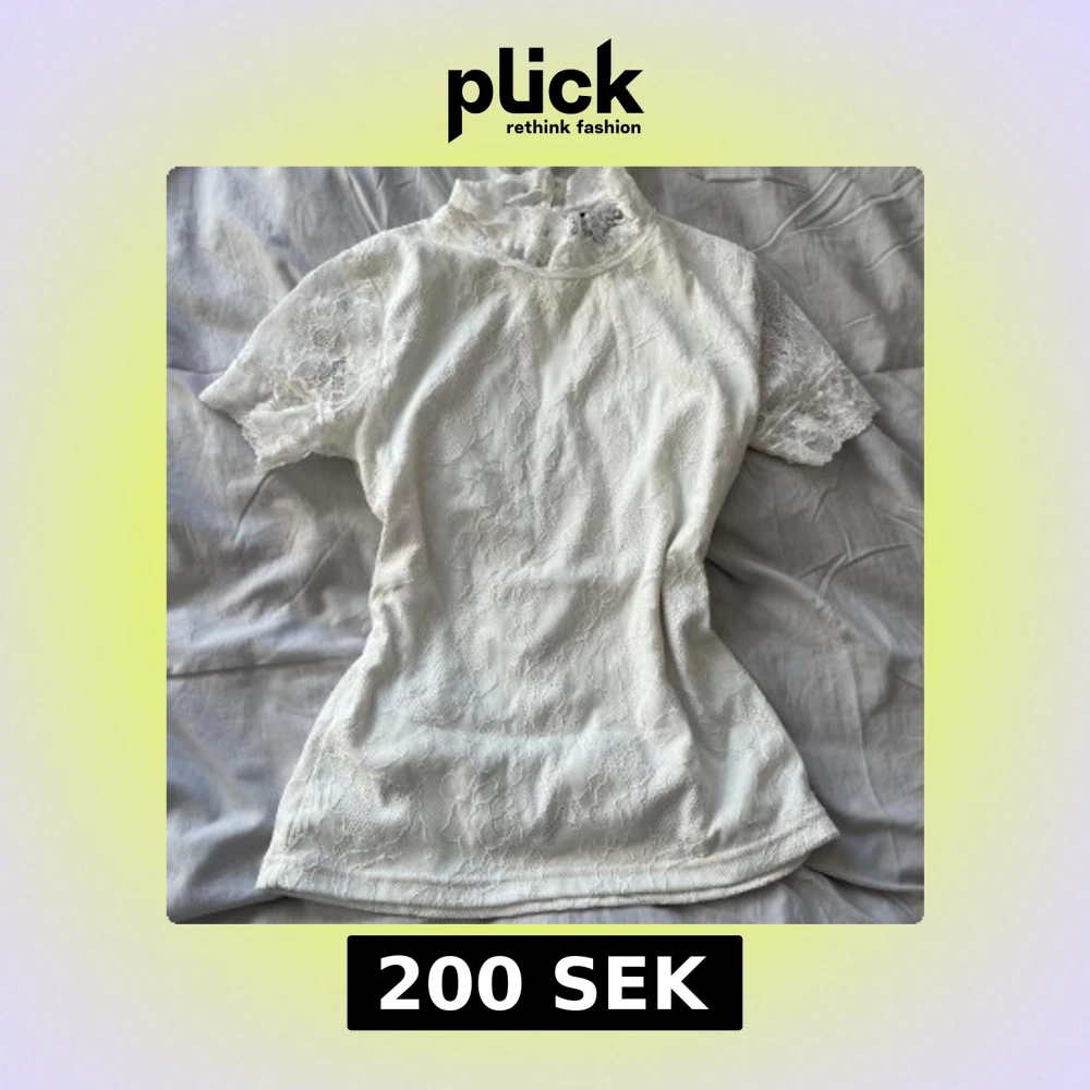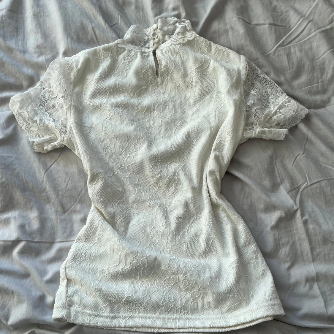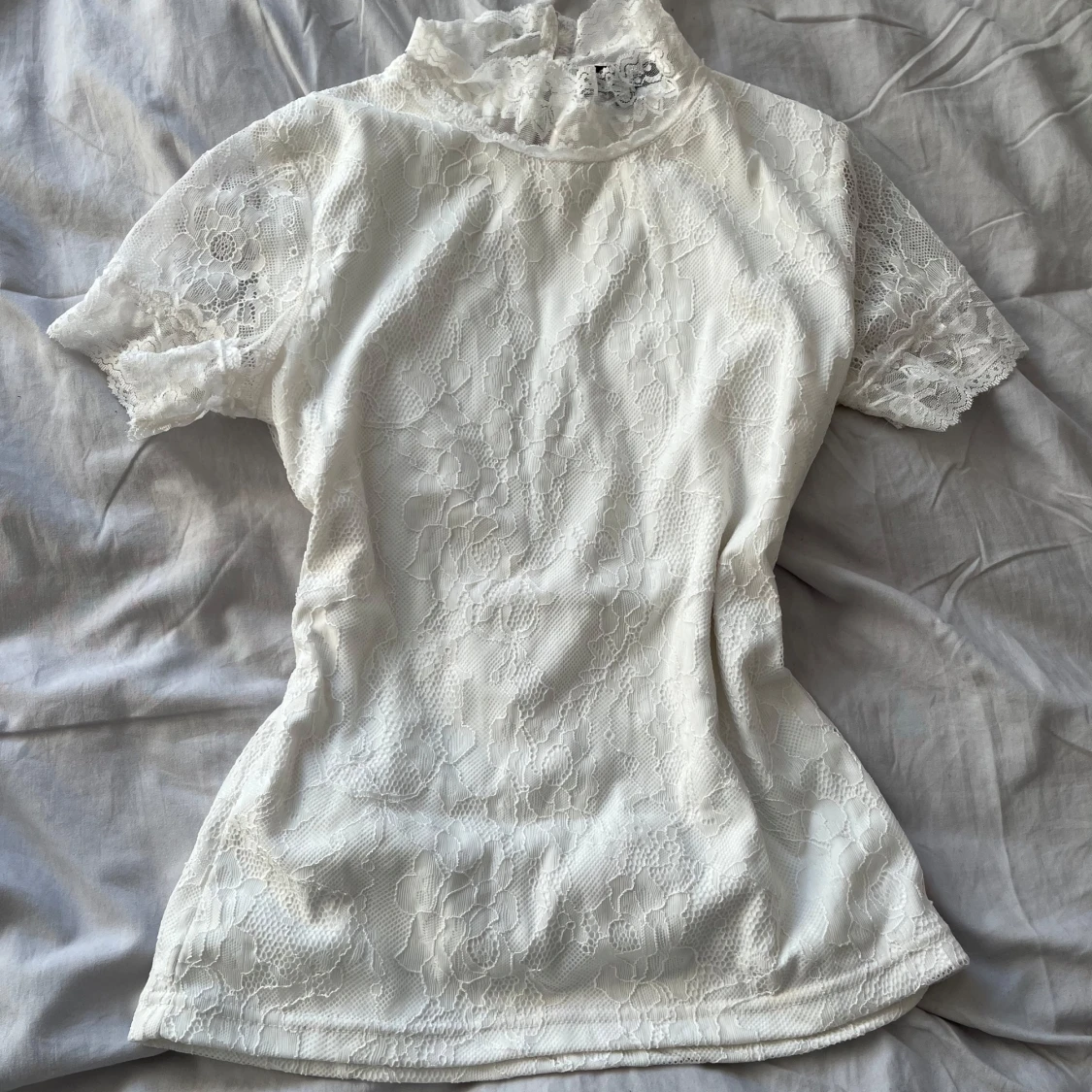 Vit spetsblus med korta ärmar och hög krage. Blusen har ett vackert blommönster och en knappdetalj i nacken. Passar som XS/S.