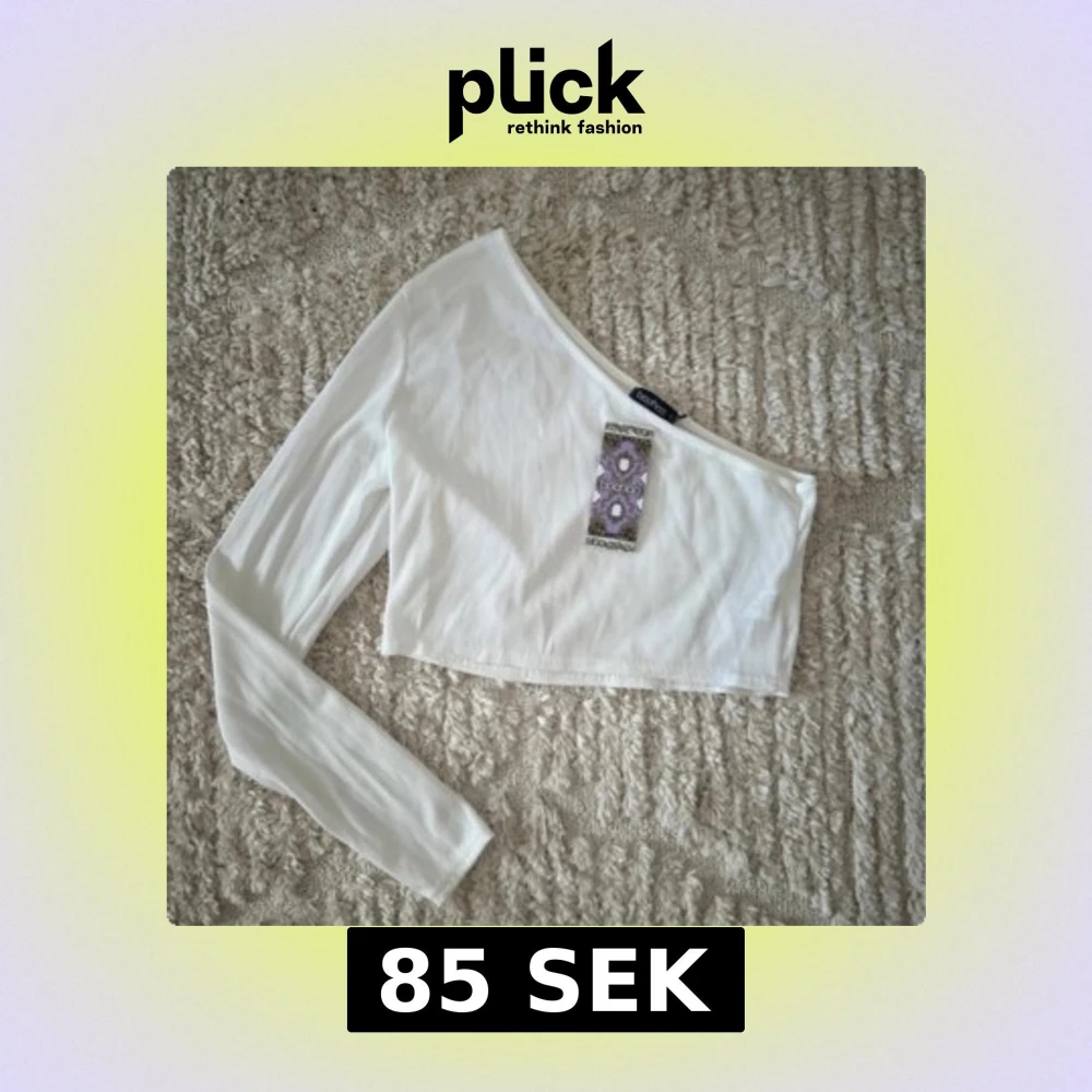 Snygg vit oneshoulder topp från Boohoo. Den är croppad och har en lång ärm på ena sidan. Perfekt för en trendig look. Oanvänd med etikett kvar.