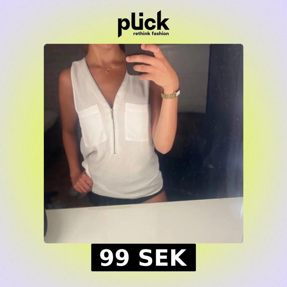 Snygg vit ärmlös linnetopp med två stora bröstfickor och en djup v-ringning med dragkedja framtill. Perfekt till sommaren och enkel att matcha med både jeans och shorts. Lätt och luftig känsla. Skriv för fler frågor!