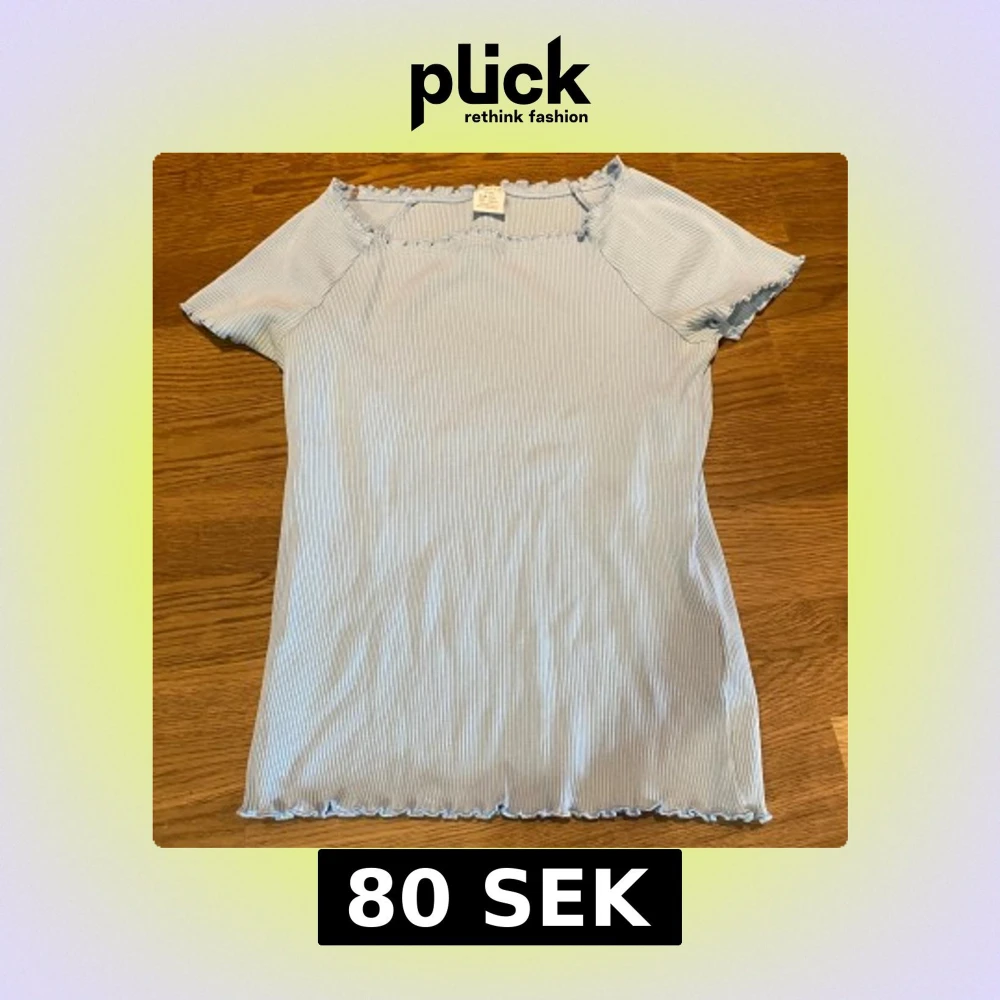 Säljer en ljusblå ribbad topp från Lindex med korta ärmar och små volangdetaljer vid halsringning 🙏 Toppen har en smal passform och är perfekt för vår och sommar 💕knappt använd