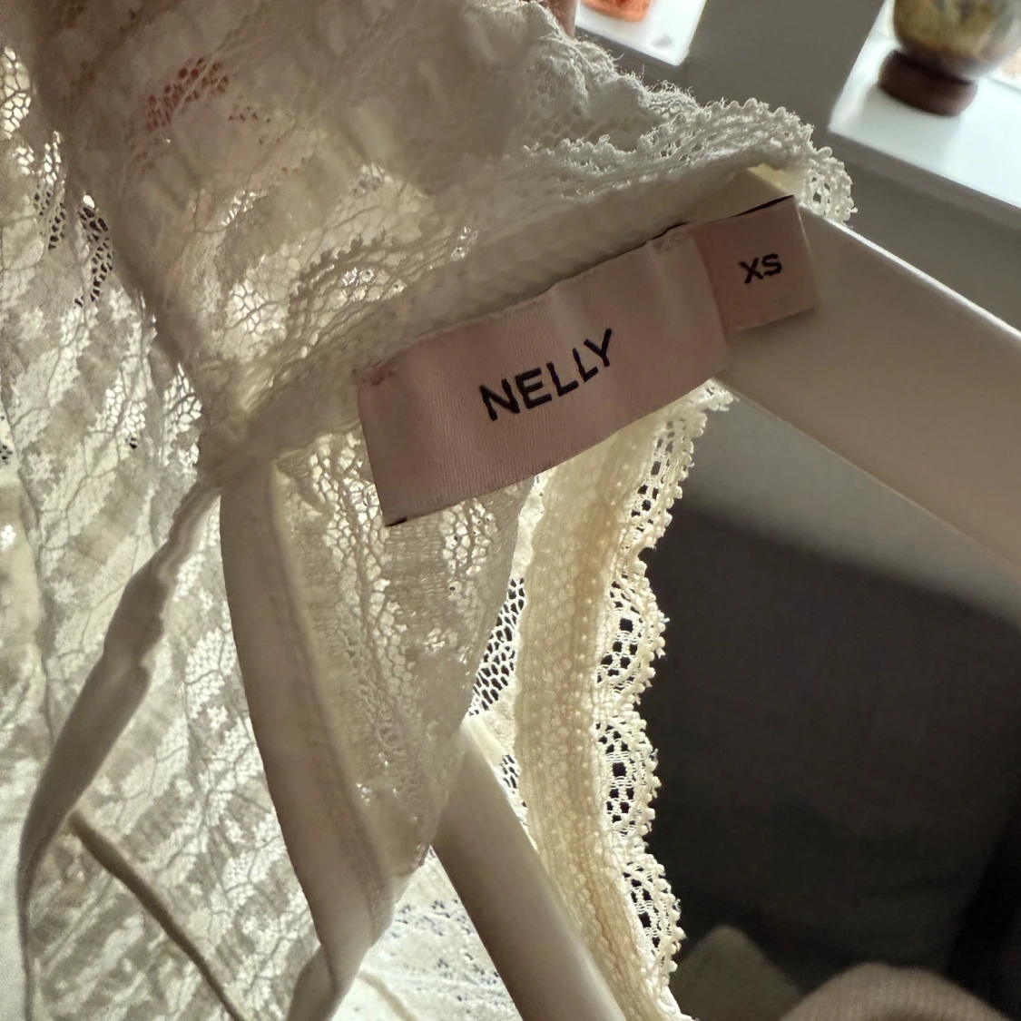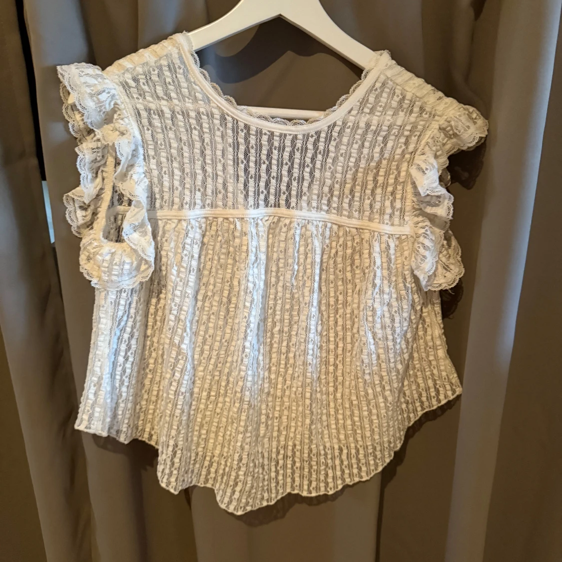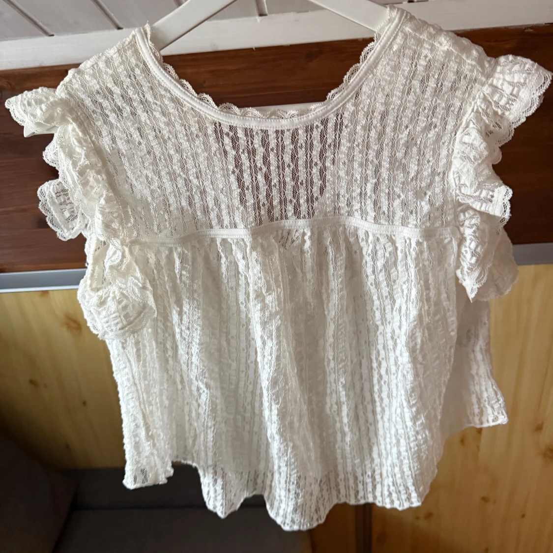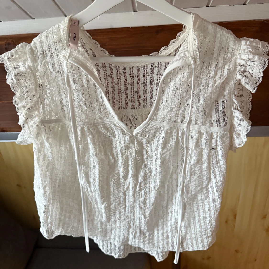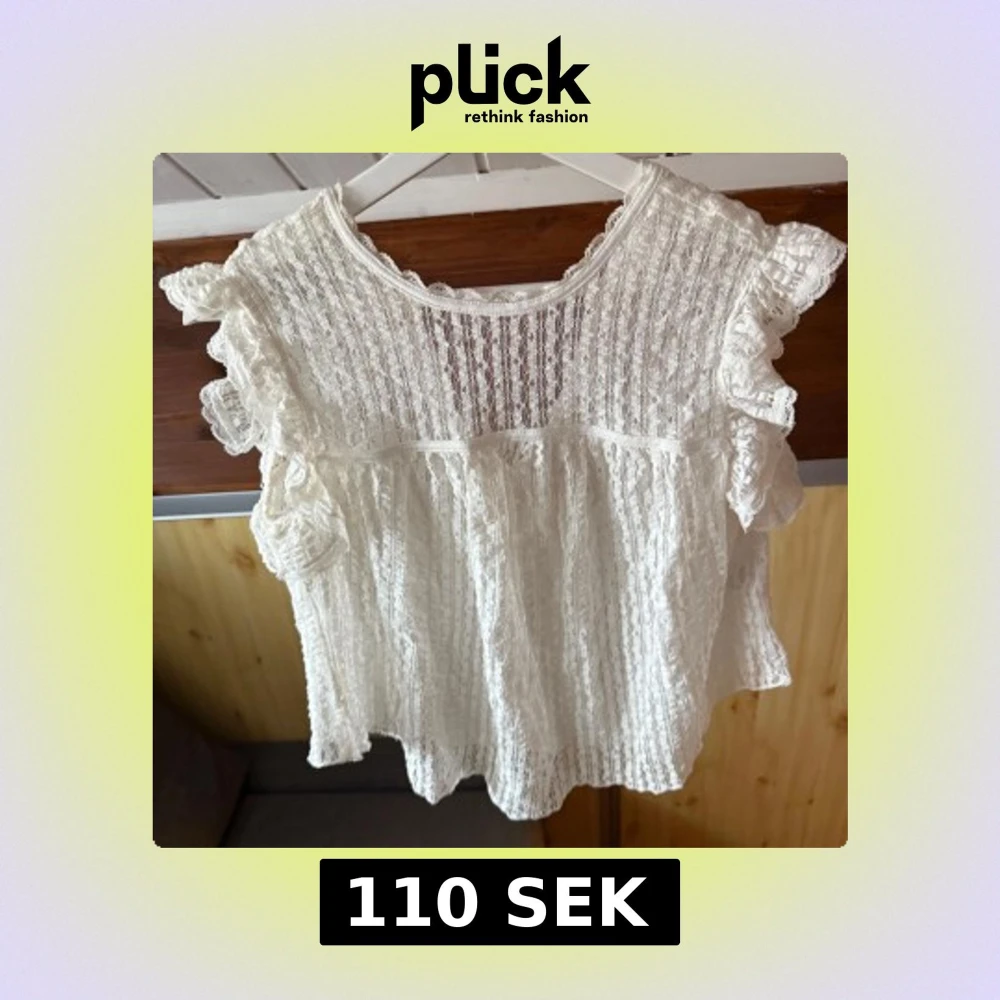 Säljer en söt vit spetsblus från Nelly med volangdetaljer och korta ärmar, använd en gång