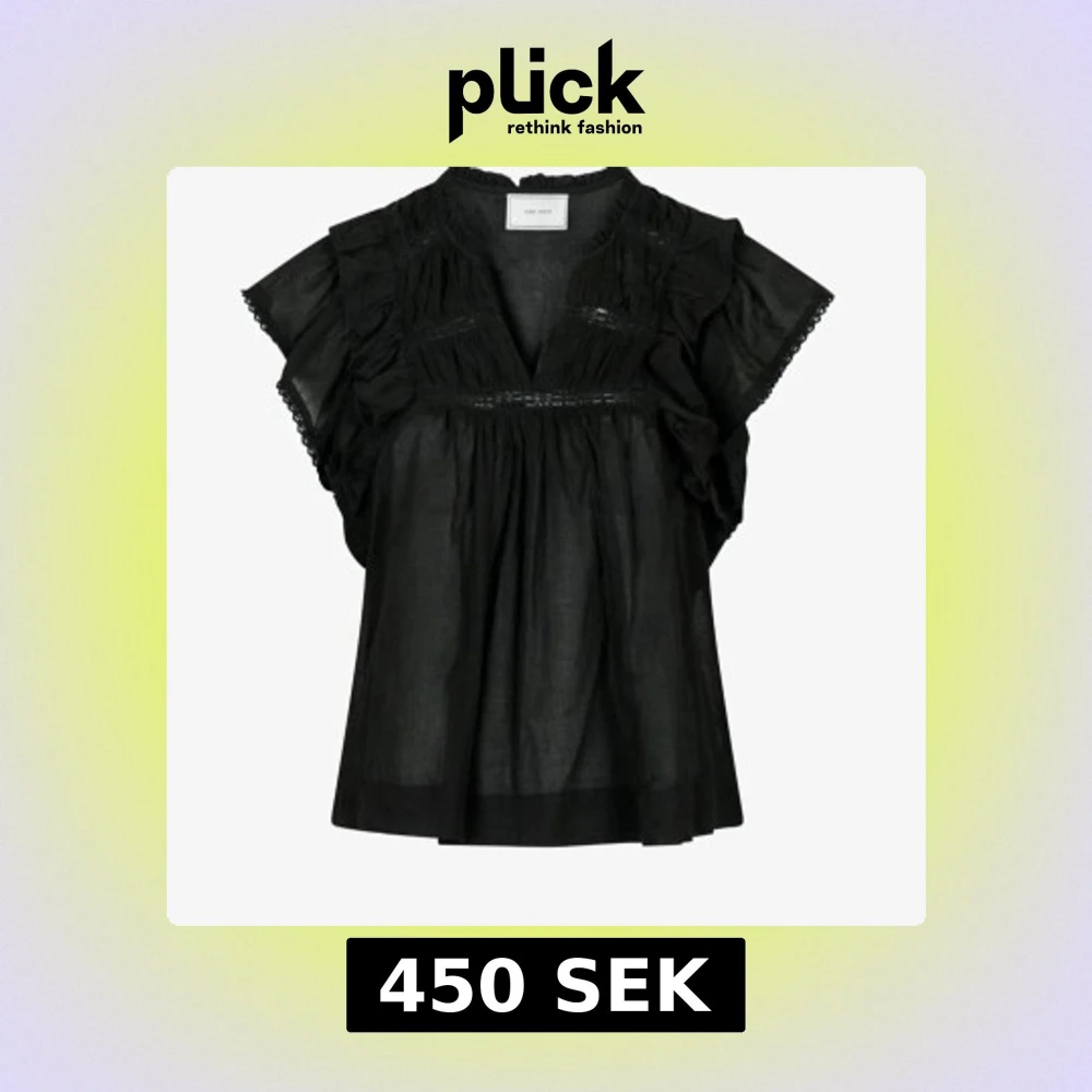 Supersnygg svart blus från Neo Noir med volangdetaljer och v-ringning. Blusen har korta ärmar med spetskant och är tillverkad i ett lätt, luftigt material som ger en flowy känsla. Perfekt för dig som gillar romantiska och trendiga plagg.