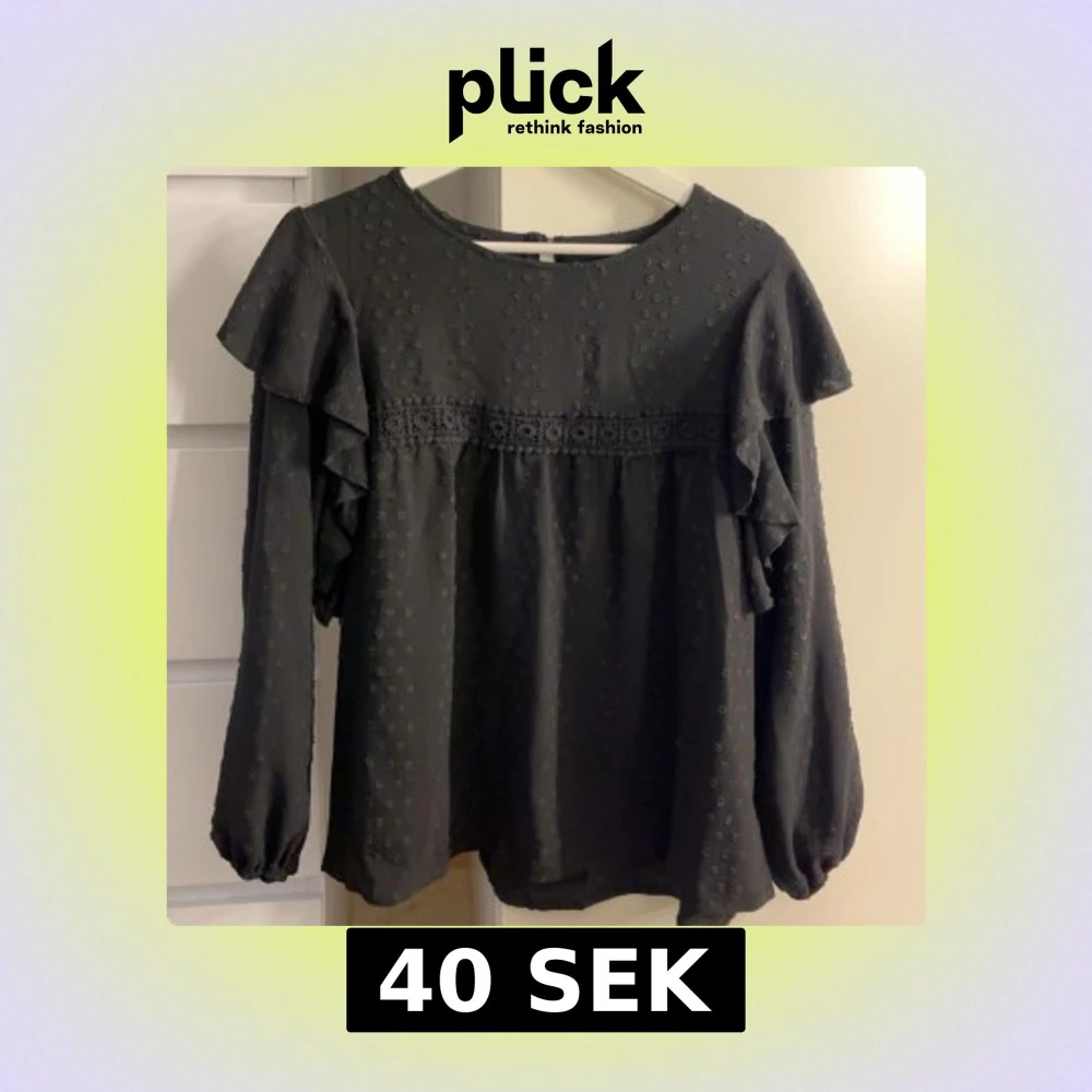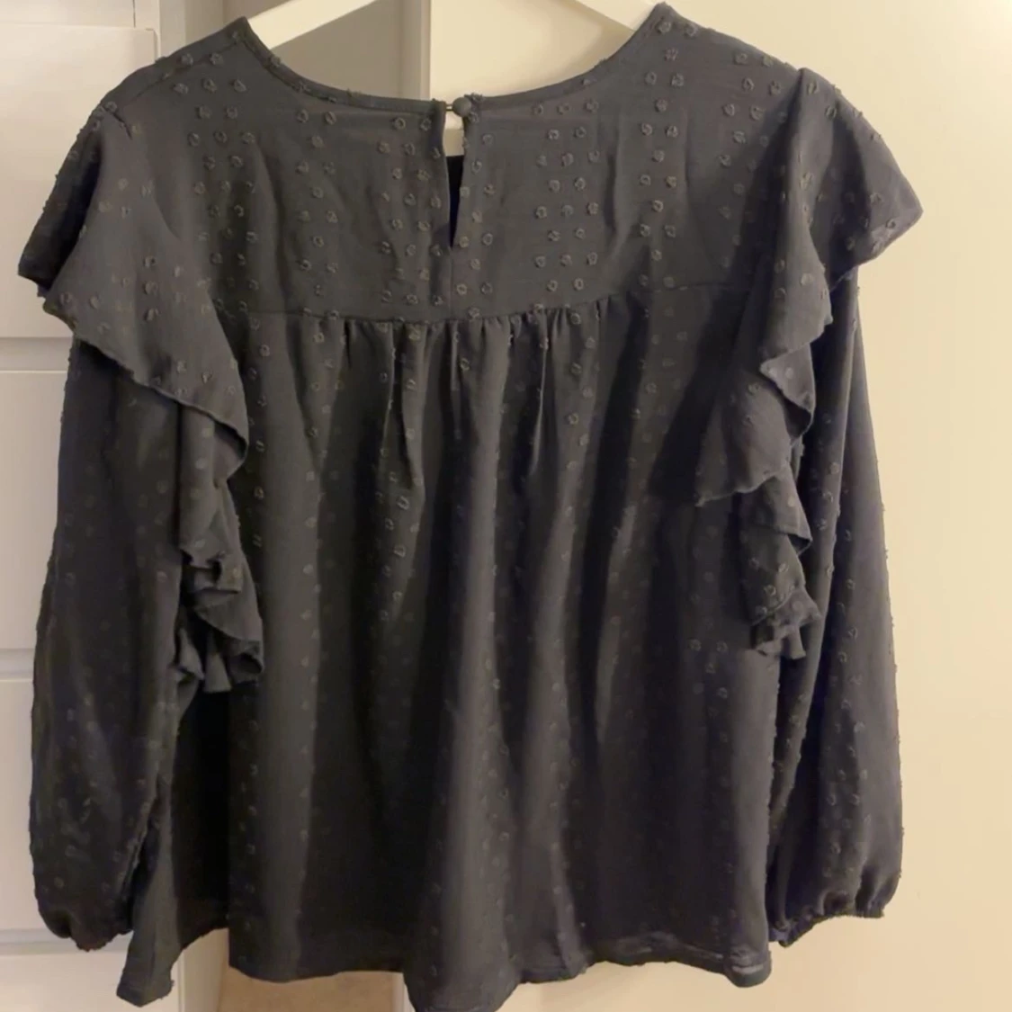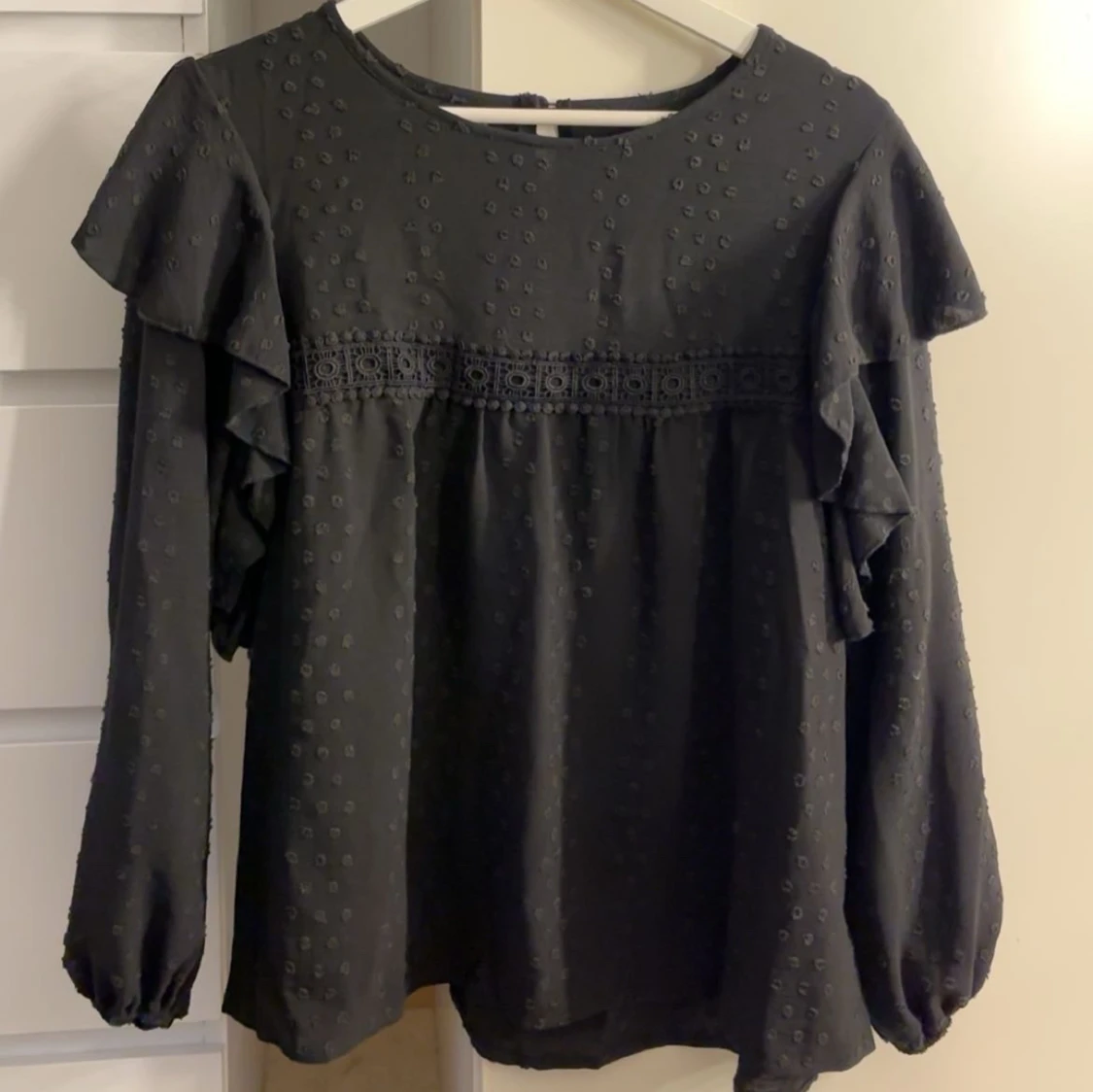 Säljer en svart blus med diskret prickigt mönster och snygga volangdetaljer på ärmarna. Blusen har rund halsringning, långärmade puffärmar och en dekorativ spetsdetalj framtill. Perfekt för dig som gillar stilrena och coola detaljer.