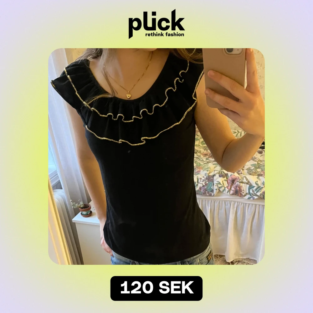 Söt svart topp med volang i fint skick. Storlek M men passar också S. Märket är okänt💕