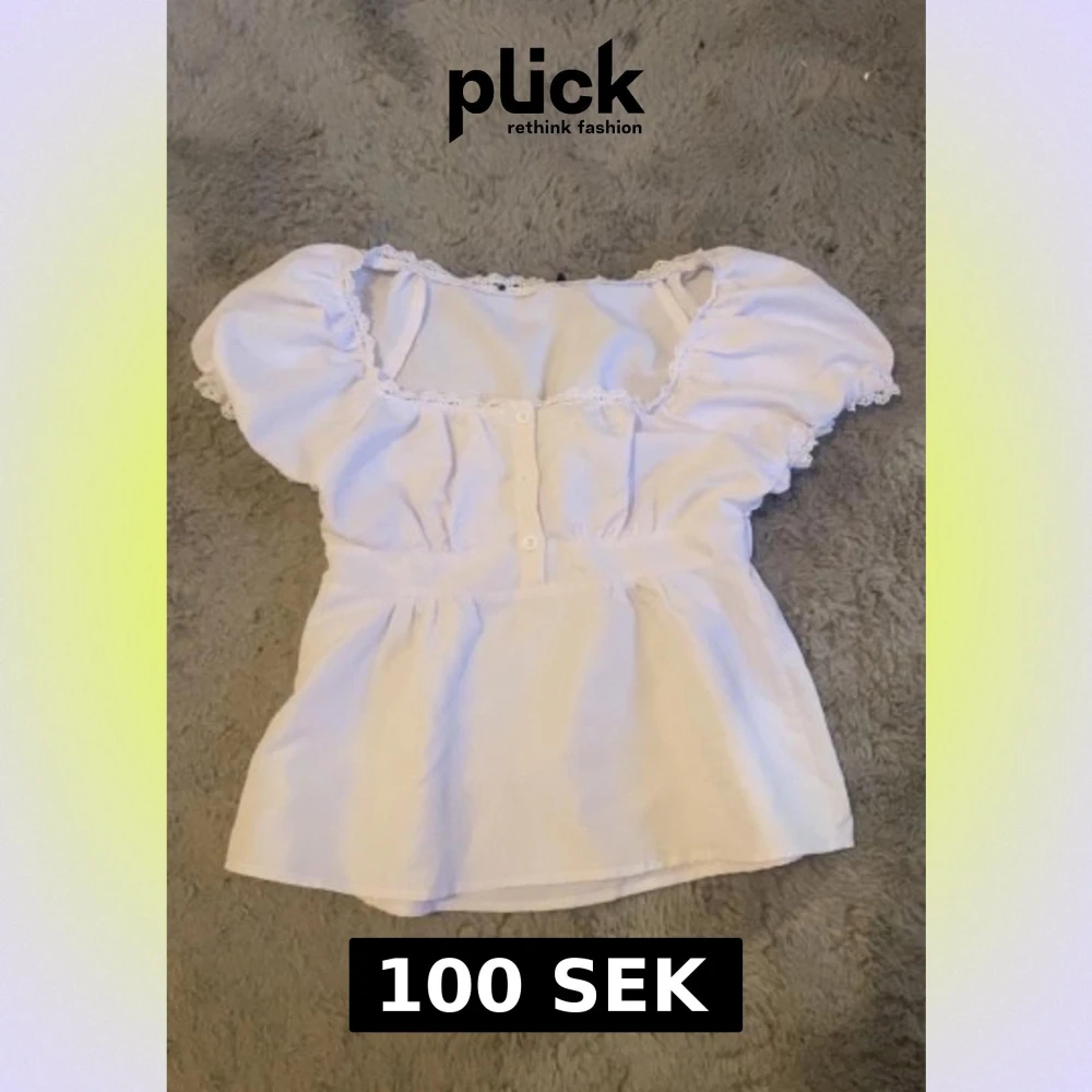 Säljer en söt vit blus med puffiga korta ärmar och spetsdetaljer längs halsringningen och ärmsluten. Blusen har knappar framtill och en markerad midja som ger en feminin siluett. Perfekt för dig som gillar romantisk stil.