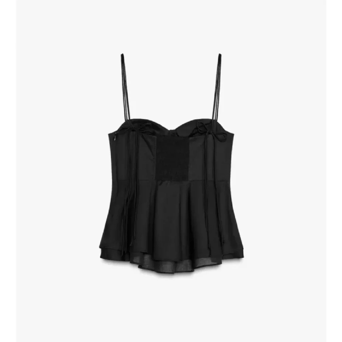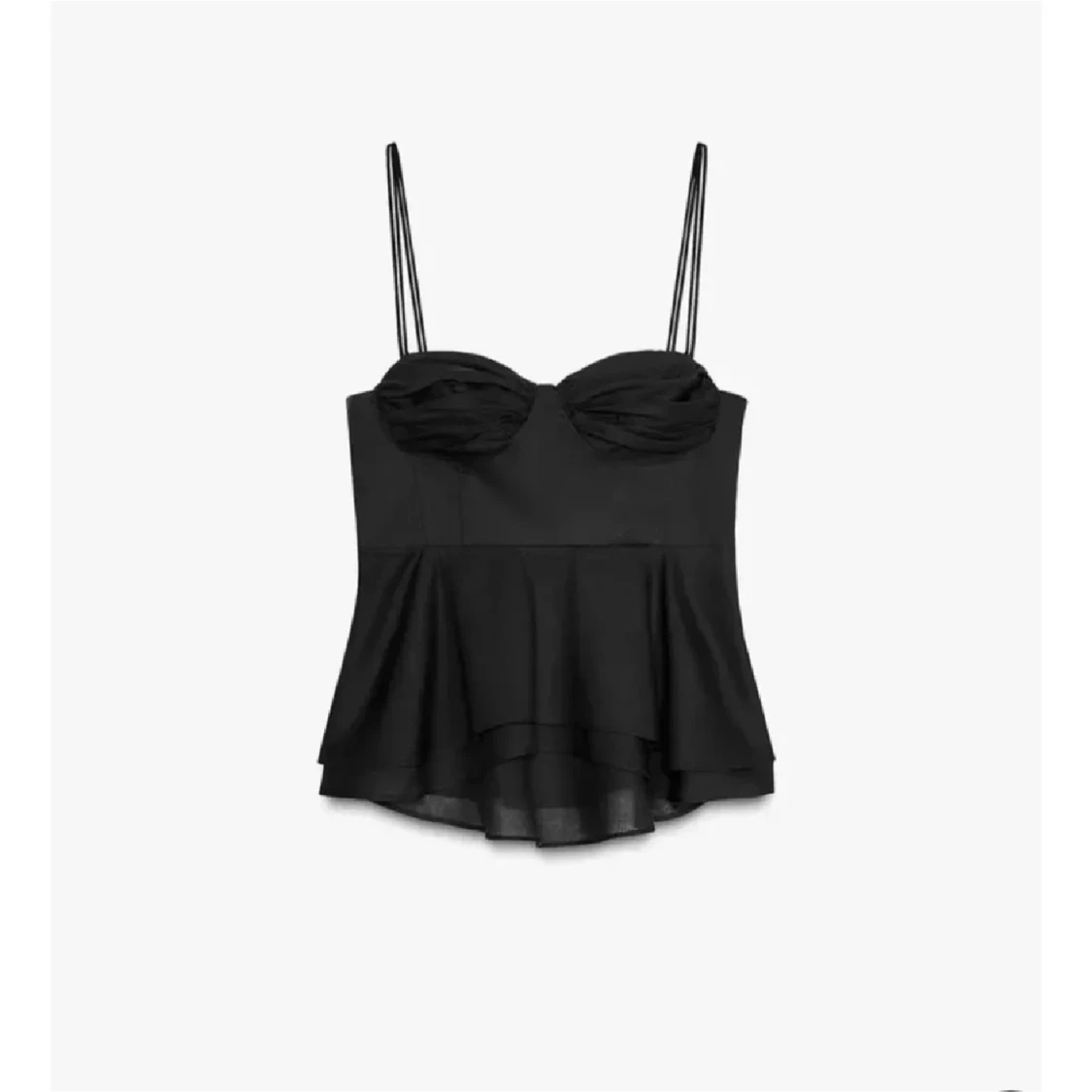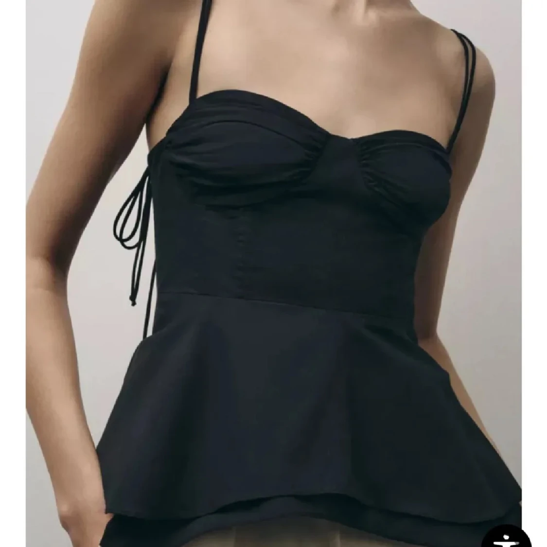 Supersnygg svart korsettopp med tunna axelband och volang nertill i storlek XS. Aldrig använd och säljer den då den inte passade mig. Kontakta mig för bilder på tröjan.