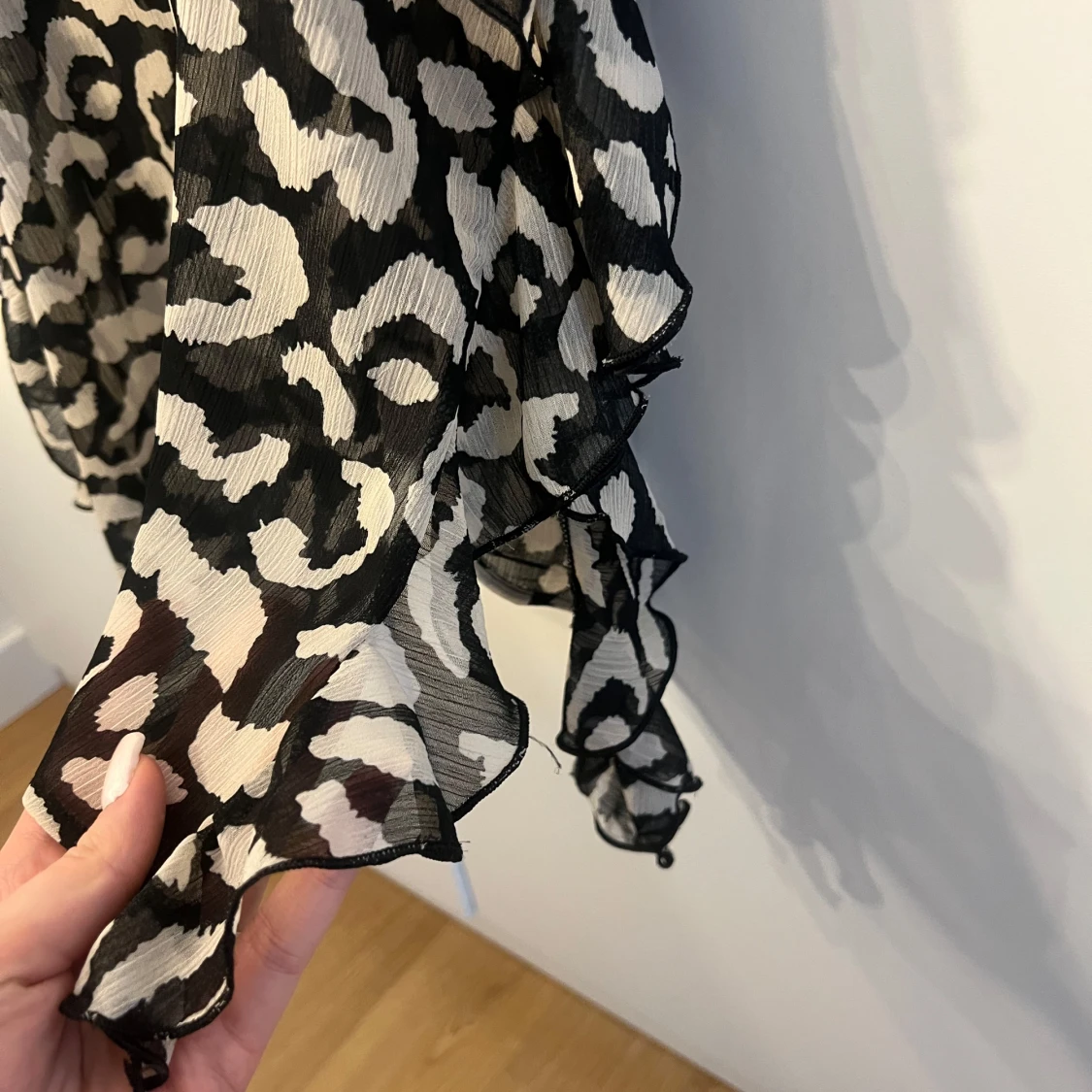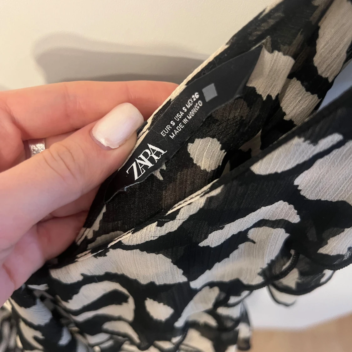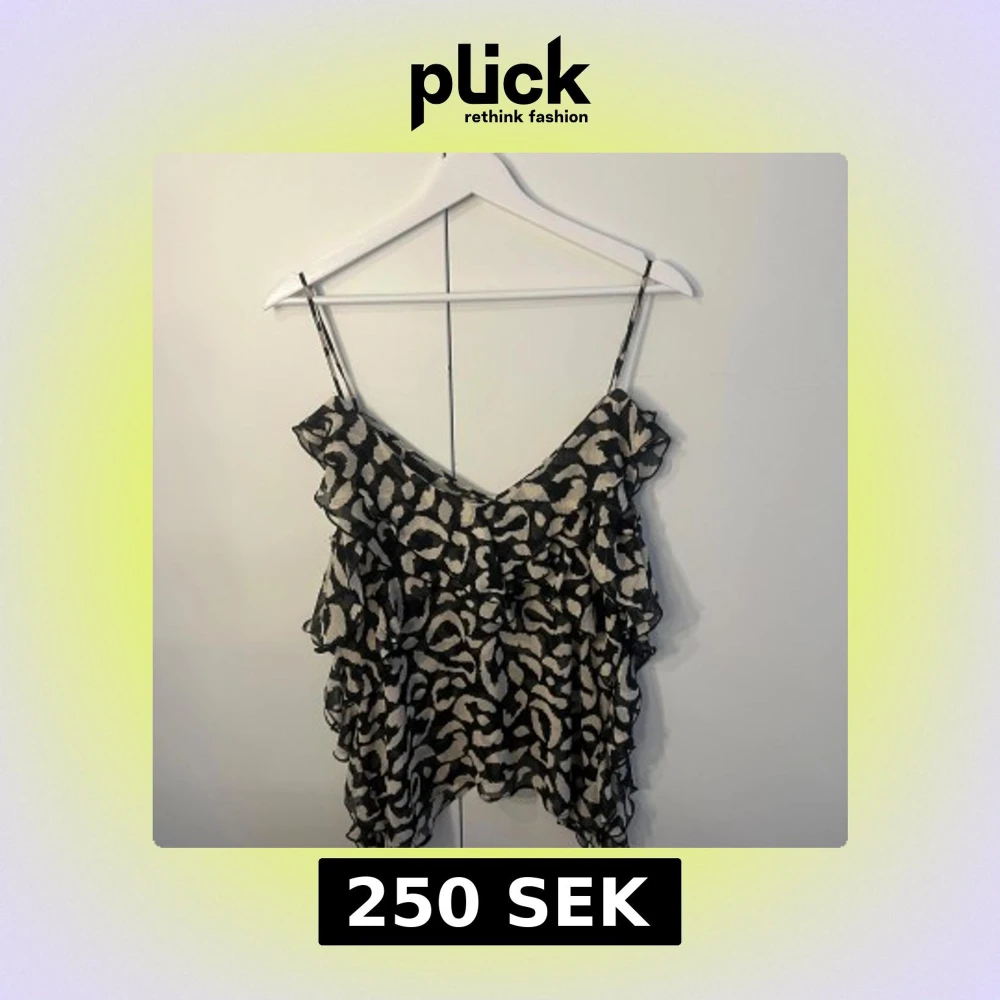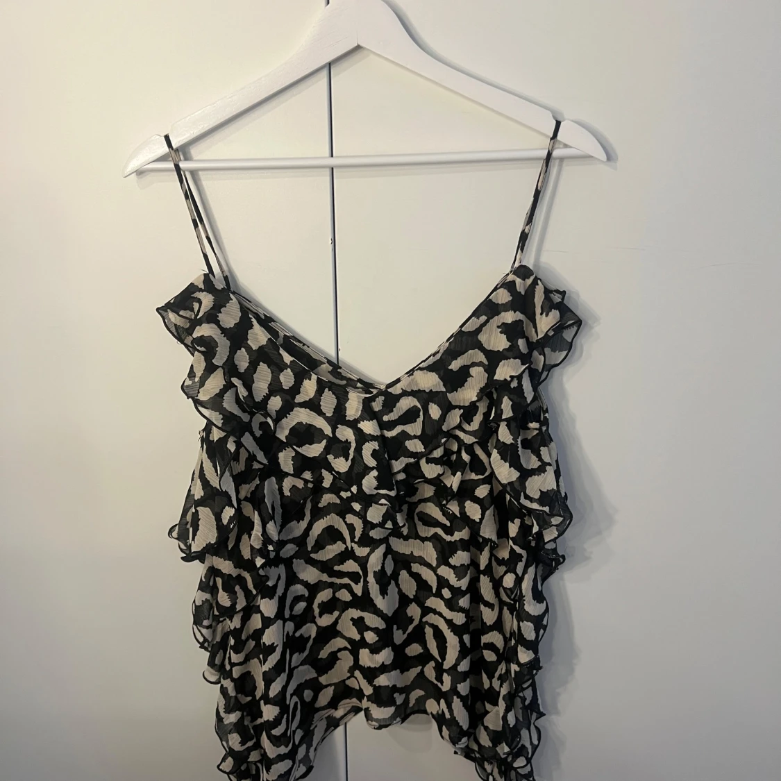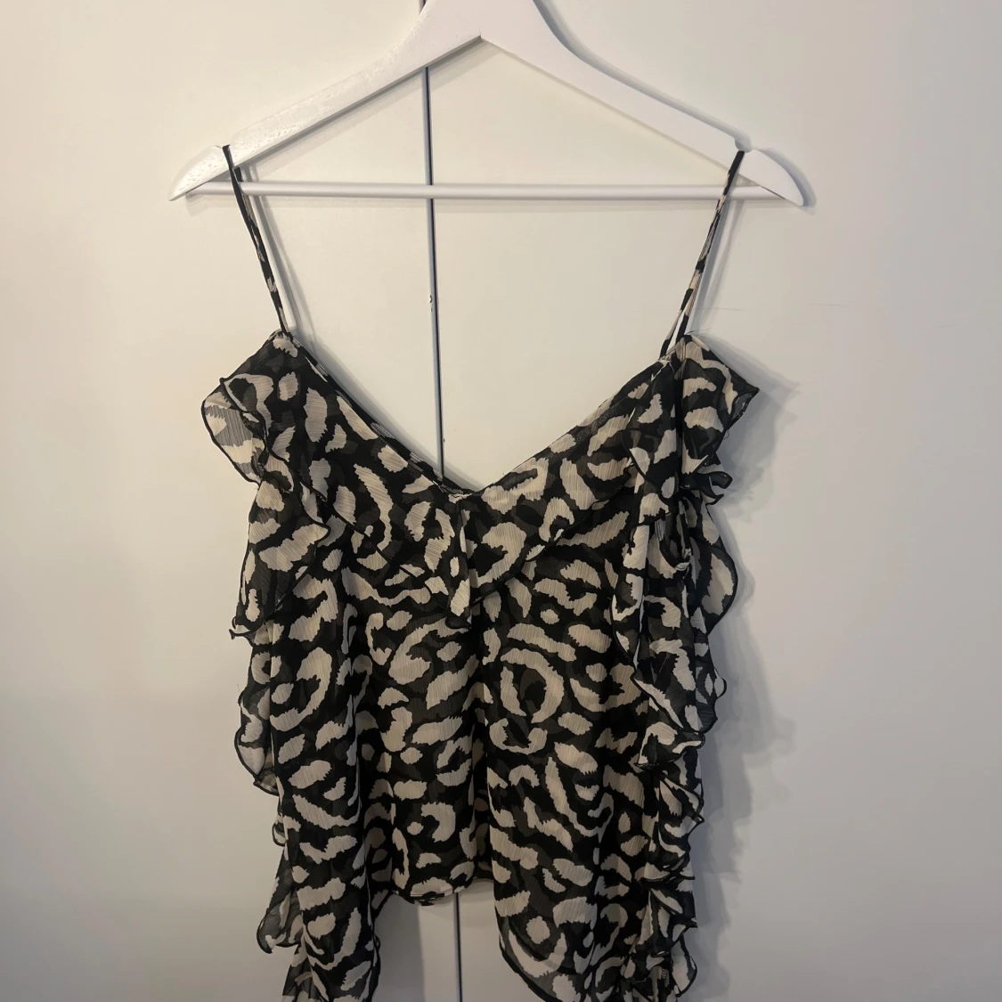 Säljer en populär topp från Zara med volanger och tunna axelband. Toppen har ett djurprint i svart och beige och är perfekt för en trendig look. Den är luftig och har en härlig volangdetalj som ger extra stilpoäng.