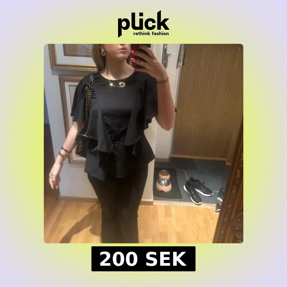 Säljer en svart blus med snygga volangdetaljer framtill och på sidorna. Blusen har vida, korta ärmar och en lös passform.Perfekt nu till hösten🩷